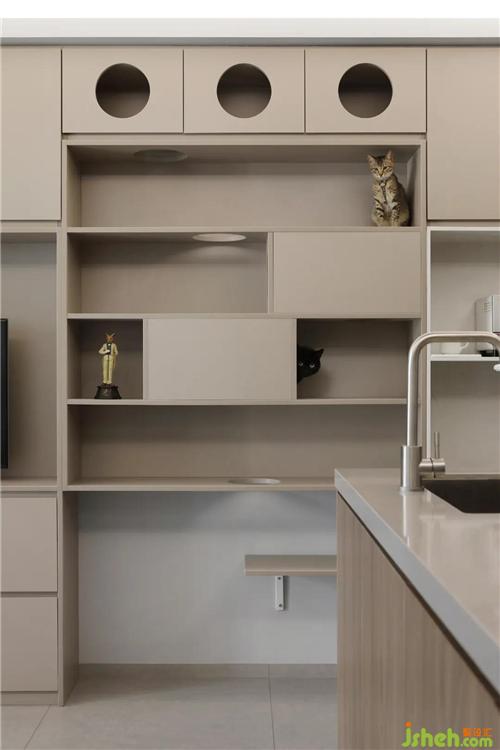 可以躲猫猫的整体家具定制,是第二处空间魔法。猫咪敏感而独立,喜欢高处和狭小的空间,在这个空间里,它能够掌控一切。猫空间的设计,同时满足了咪酱的安全感和好奇心,它便会全身心投入到舒适的生活中,闲情雅致与人互动。