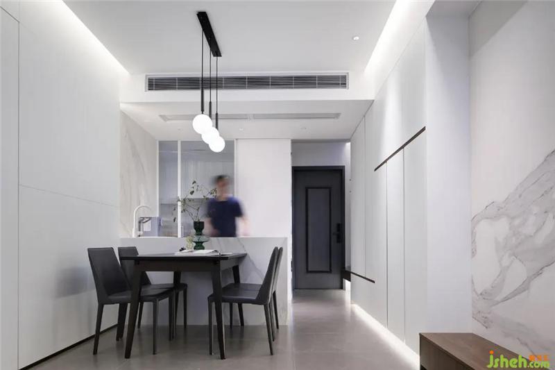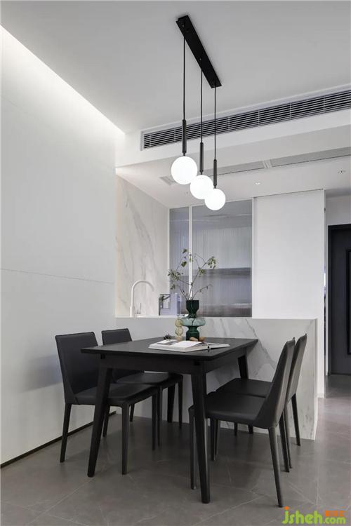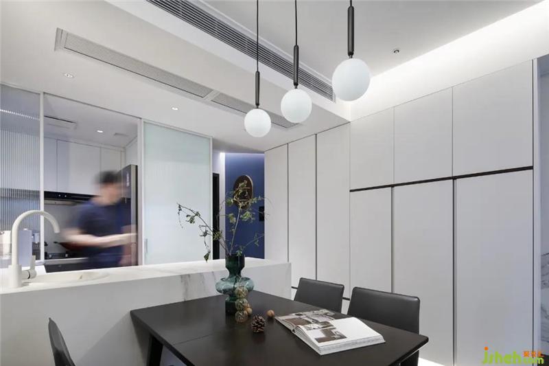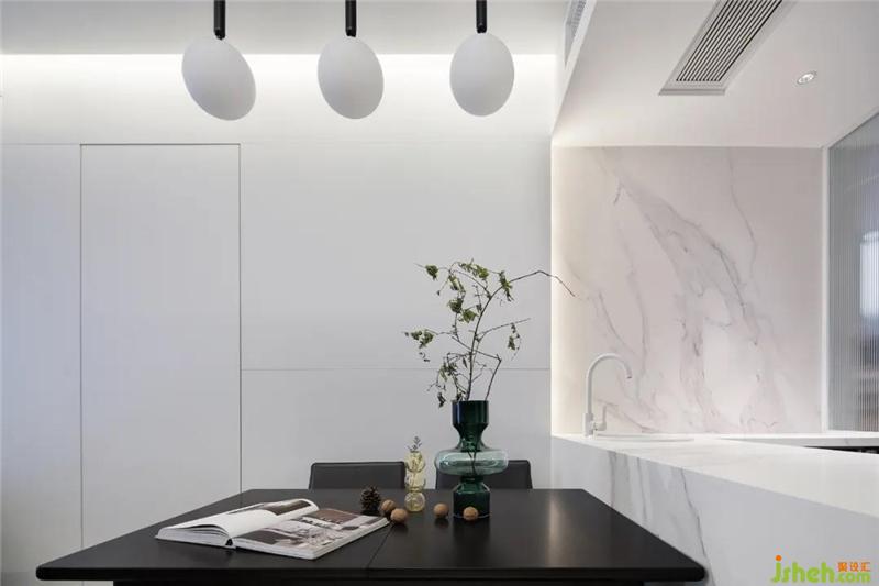 Set up a white island platform to extend the function of the kitchen and increase the level of space. The interaction between the kitchen and the restaurant was very pleasant. This is the feeling of life.