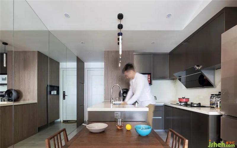 从玄关延伸至餐厅的通高镜面,增加了双倍空间的视觉效果。施展厨艺时的互动,深圳装修设计也变成了双倍的快乐。