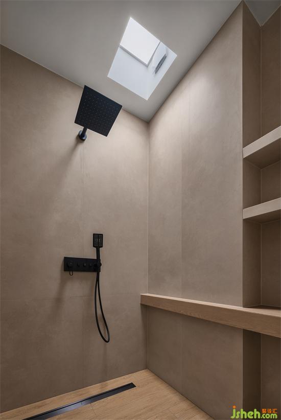 The public bathroom and the public shower are divided into two spaces. There are two concave exhaust holes in the original ceiling sedimentation tanks in these two areas. In order not to reduce the floor height, this concave hole is directly used for lighting and exhaust, which also creates a visual effect of skylight.