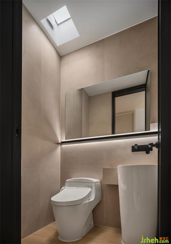 公卫和公共淋浴作二分离设计,这两个区域的原有天花沉池内有两处上凹的排气洞口(接入建筑中央管道),为了不降低层高,便直接利用了这个凹洞做采光和排气,家装设计也营造出了天光的视觉效果。