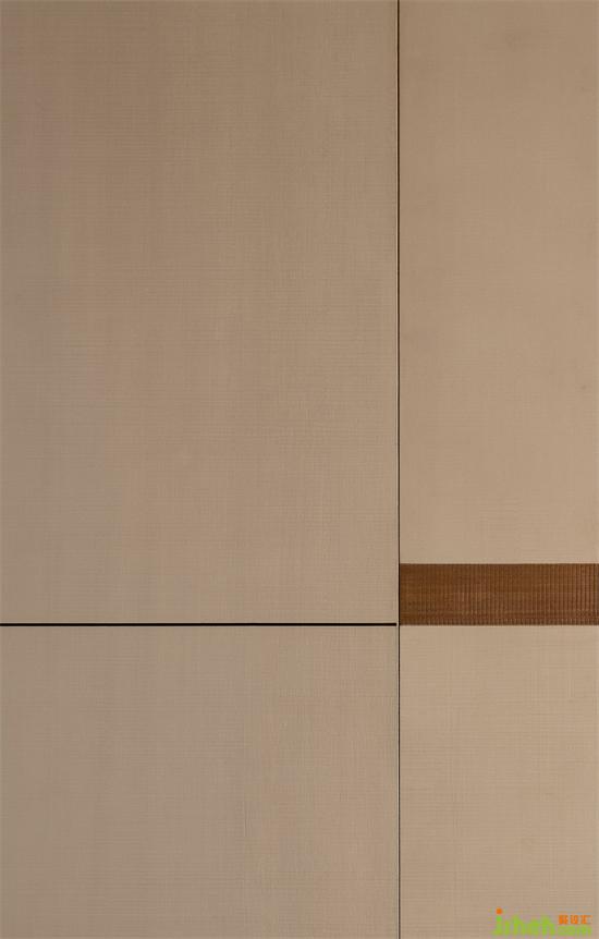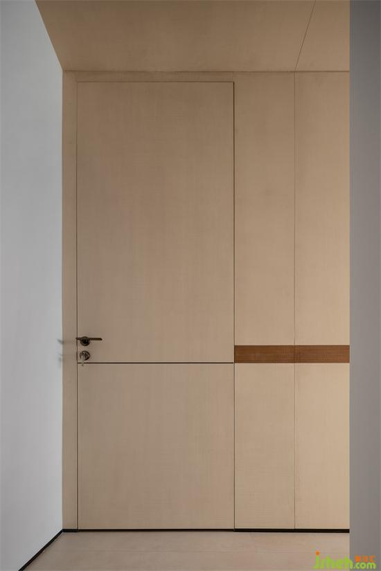前文提到的设计手法一直延伸到主卧内。主卧复合了书房、衣帽间、卧房、主卫四个功能,由多道暗门及隐藏门来分隔。家装设计特殊定制的床头装置是空间中的亮点,即是灯具,也是屏风,巧妙揉和。