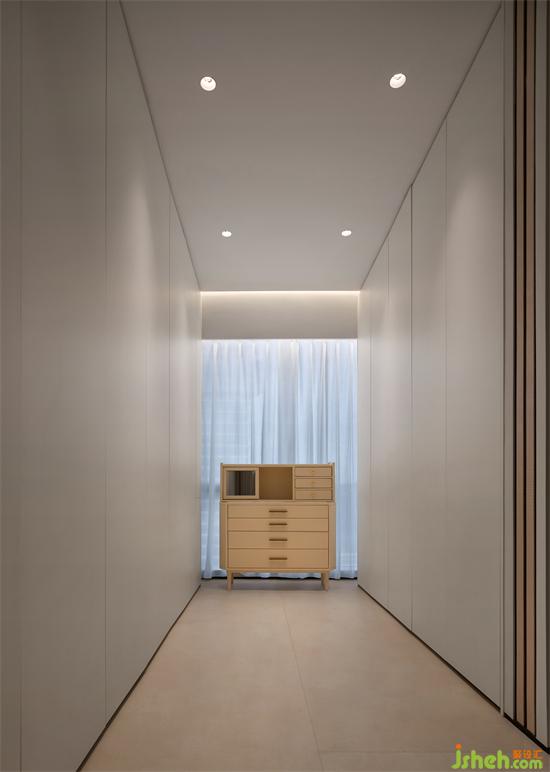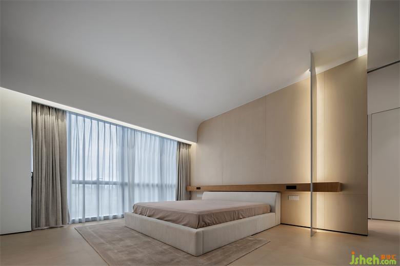The design method mentioned above has been extended to the master bedroom. The master bedroom combines four functions of study, cloakroom, bedroom and toilet, and is separated by multiple concealed doors and hidden doors. The specially customized bedside device is the highlight of the space, that is, the lamp is also a screen, which is skillfully kneaded.