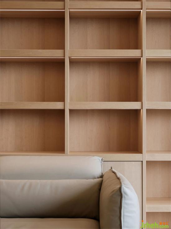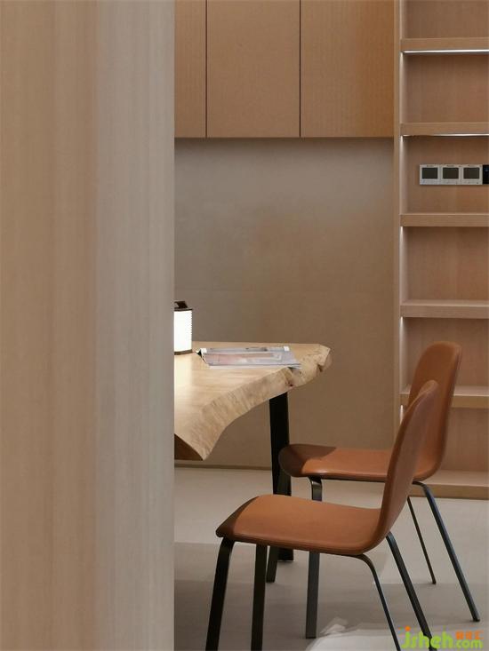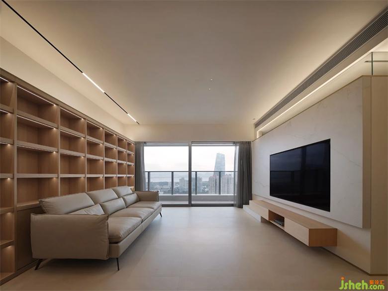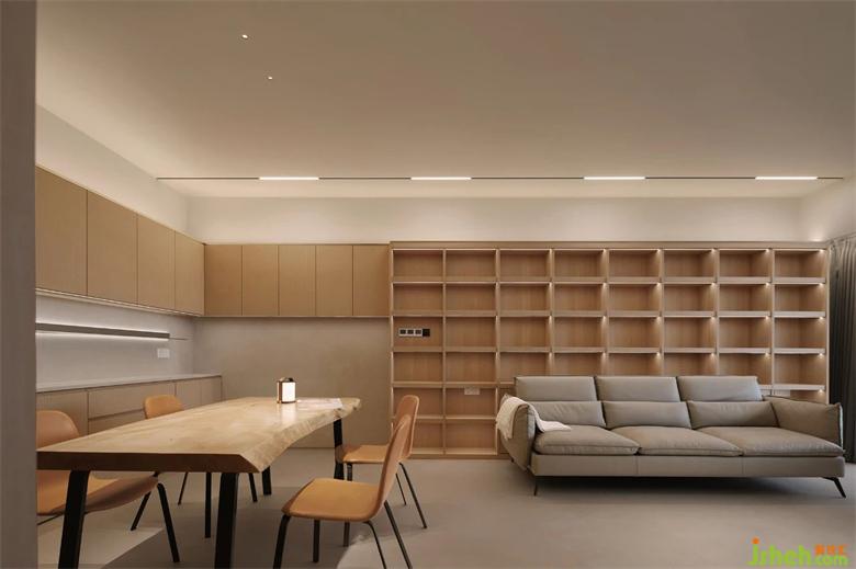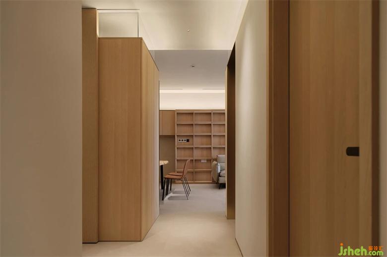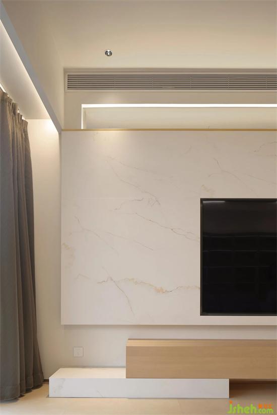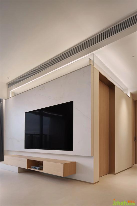 柜体不到顶的方式,一是将传统的反光灯槽转移到了柜子顶部,节省木工造价;二来保证了与不到顶墙体的视觉完成面统一;三是使得天花看起来更为高挑。