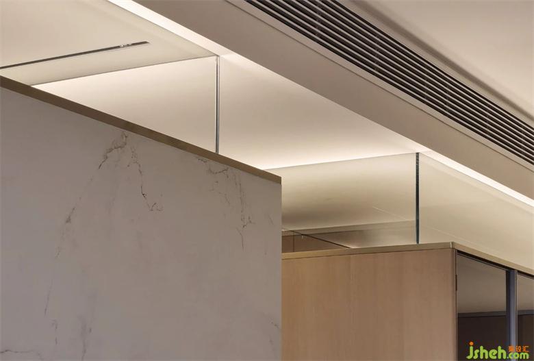 墙体不到顶的另一个好处,便是将中央空调等设备放置在客餐厅区域以外,深圳天鹅湖花园家装设计不需要做走边叠级,实现空间高度最大化。