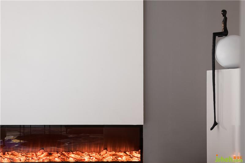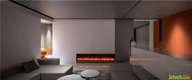 呼应会客区,吧台通道进行了抬升设计,使整体办公设计空间呈现起伏与变化。拾级而上通往总监办公室。廊道之上,波纹板天花营造出波光粼粼的水倒影效果,与壁炉腾起的火焰辉映成趣。