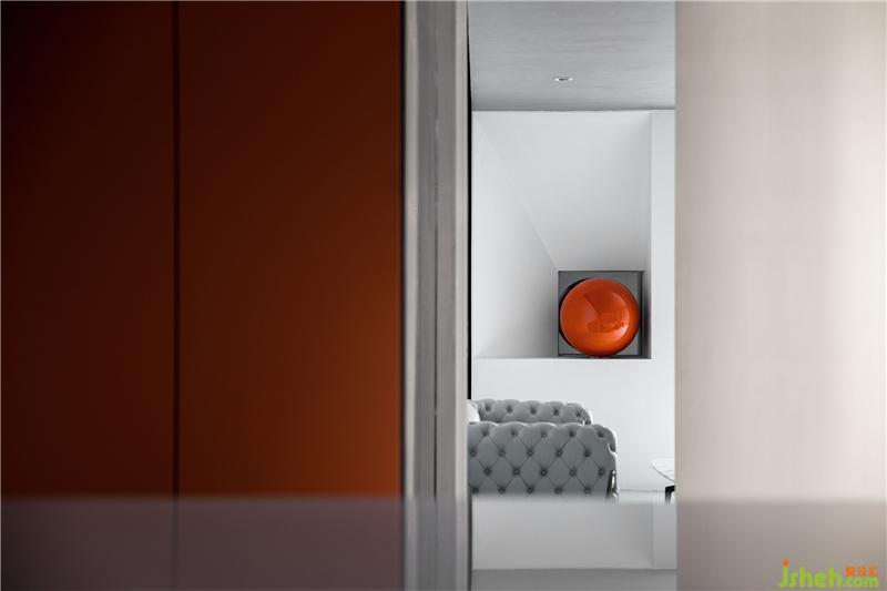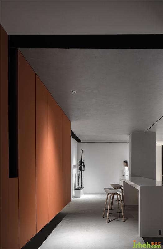 吧台处望过去,橙色支点装置藏于一隅,俏皮而恰好,将规整的几何空间打破,让气氛变得活泼。