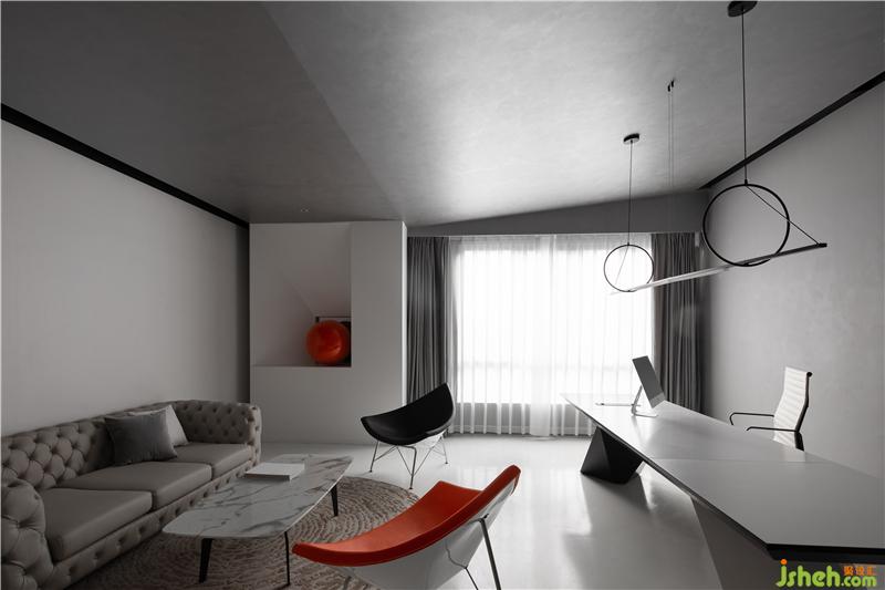 总监办公室沿用主体灰调的极简设计,散发出理性、包容与思考。橙色支点装置的存在则代表着颠覆、创造和特立独行……