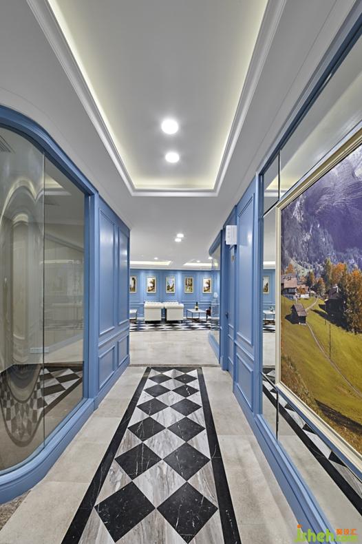 一层强调英伦的雅致及品位,用浅蓝色欧式墙面穿插整个空间,强列的空间视角关系,让客户流连忘返,记忆深刻,达到商业医院经营的目的。