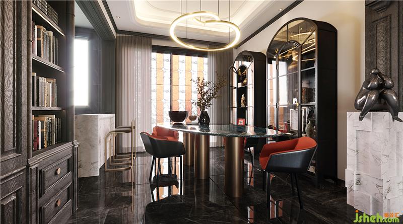 拆除原书房墙体,将一半面积设计成一个开放式书吧,与客厅相连,扩大了公共区域可视面,着重强调家庭的互动性,让一家人在家庭核心区能够有更多更好地交流、互动。 书吧兼作游乐区、学习区,平时在工作或娱乐的同时,可以留意孩子的情况,孩子在公共区域做作业比一个人在房间做效率更高。