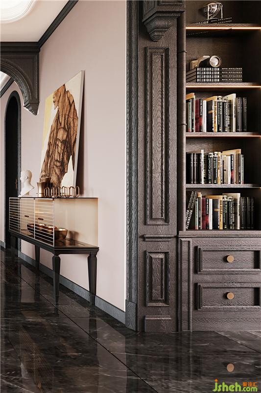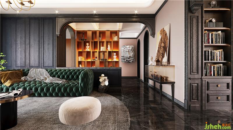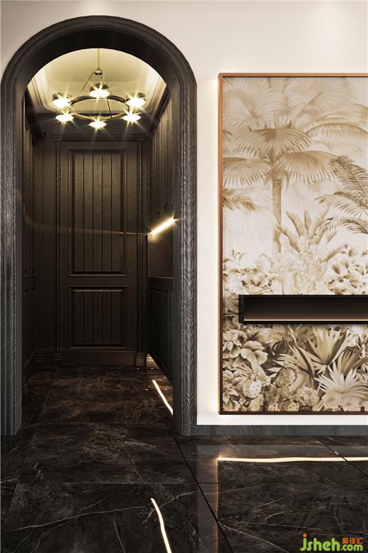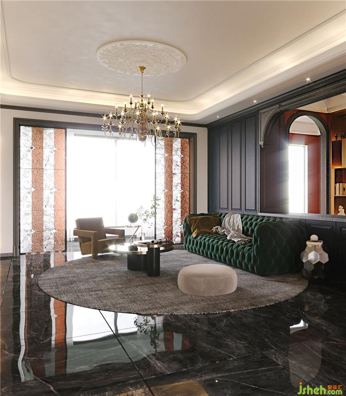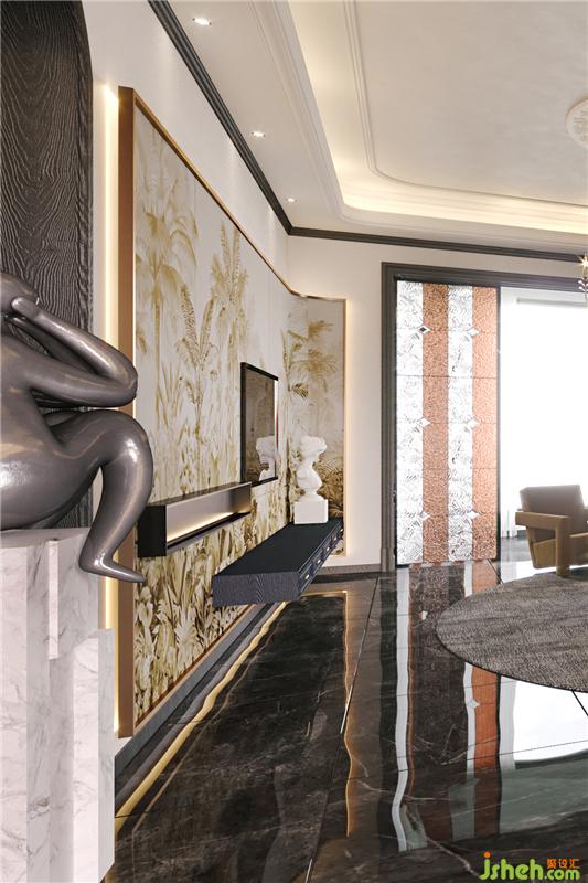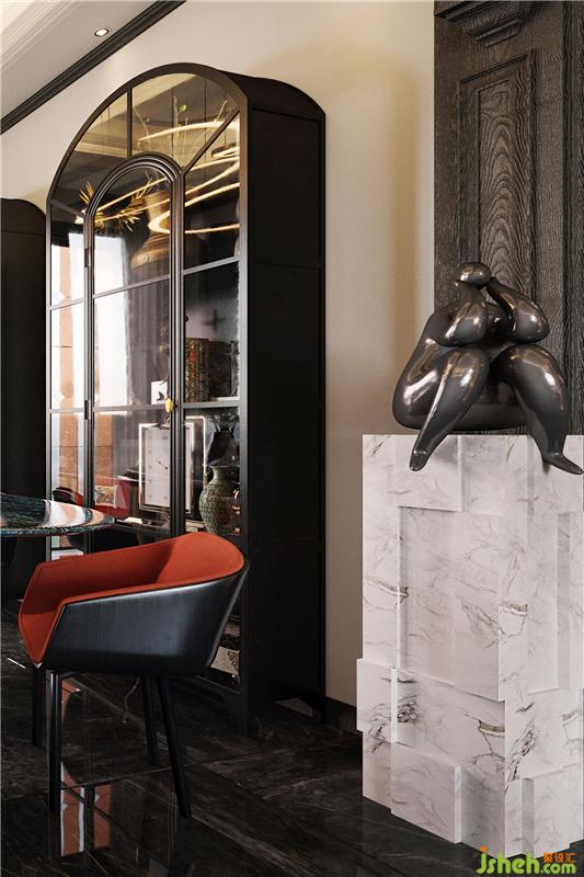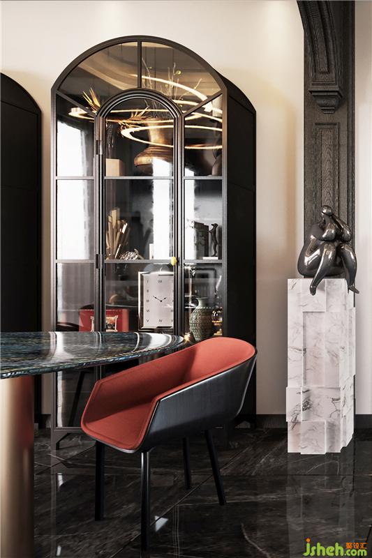 LDK整个空间主要以木质、金属和石材来呈现,搭配精致的软装家具,丰富整个空间的层次感,营造出浓郁沉稳的基调。 地面选用深色大理石石材,天然纹理,与进口红橡木所组成的线面浑然一体;客厅电视背景墙则采用简欧风格的墙布,两者之间形成独特的空间氛围。 餐椅的枫叶红作为空间亮点,很好地提升了空间的活泼度,明亮而愉快。