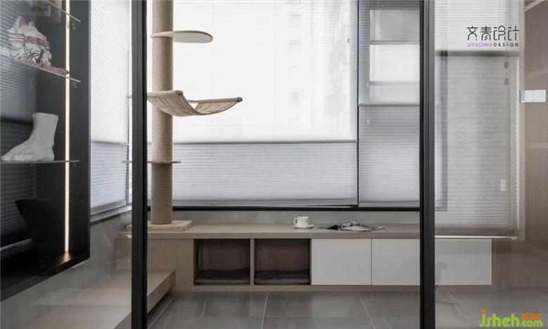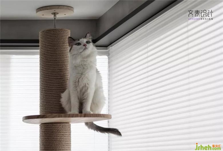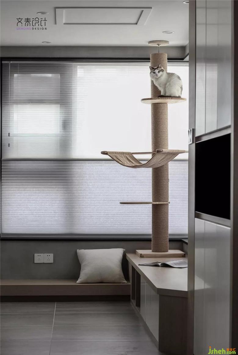 撸猫区,在设计师心里其实并没有划分地这么明确,这个区域配合飘窗做了个低矮的储纳纳柜,目的是为了让业主阅读休闲时更方便地与它家的布偶猫更好地互动。