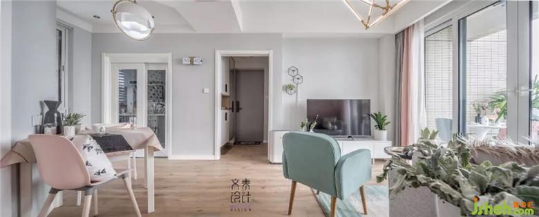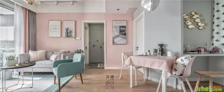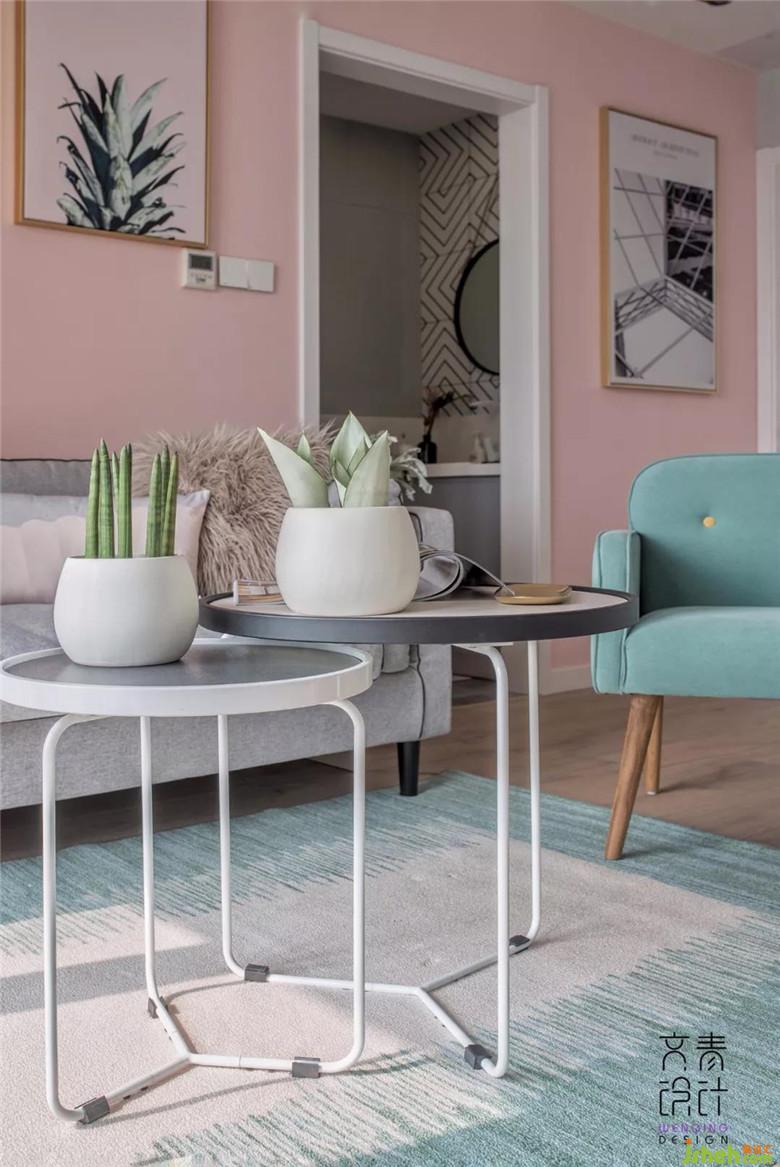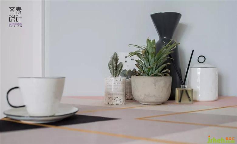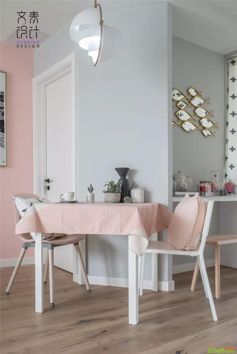 在这个可爱的小窝里,客餐厅依旧是紧密相连的,为了顺应户型的格局,餐厅的设计巧妙的采用了侧切式的格局,餐桌紧贴着这块斜方的墙面,这样的设计既充分的利用了这片小空间,又不失美观大方,营造出来的温馨质感瞬间圈粉,二人世界,烛光晚餐,突然有点甜。