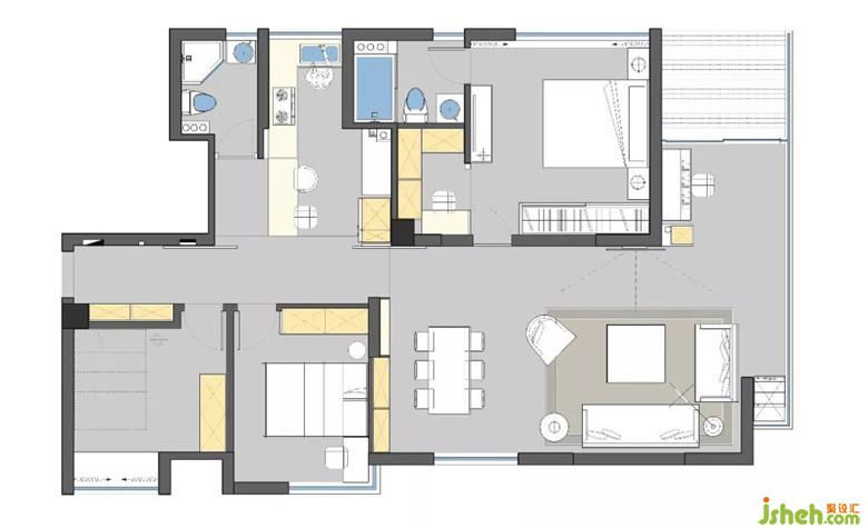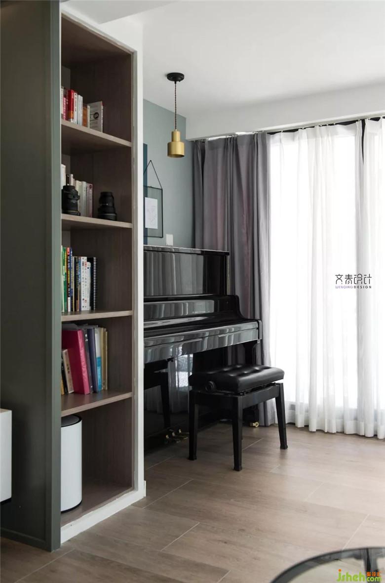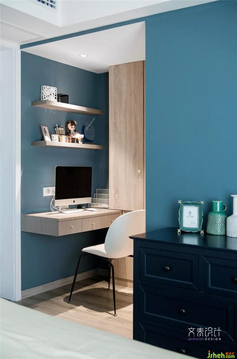 这更衣间兼书房的区域,原是卫生间门过道。封闭后,卫生间开到房间里侧。利用这处原先浪费的空间,打造成储纳和功能兼具的小空间。