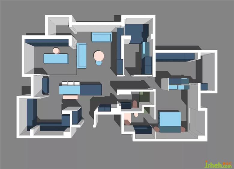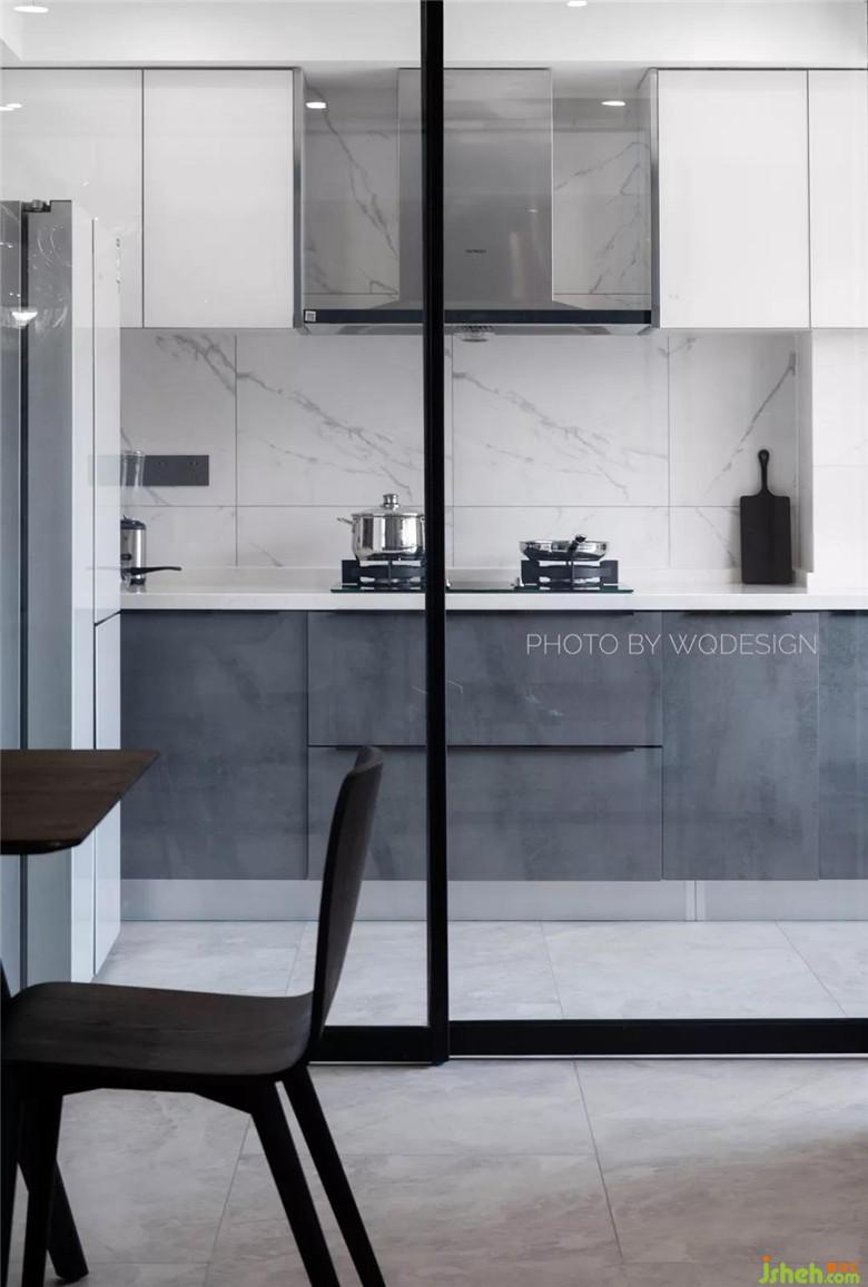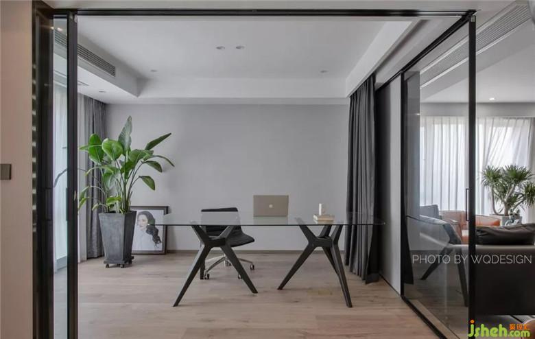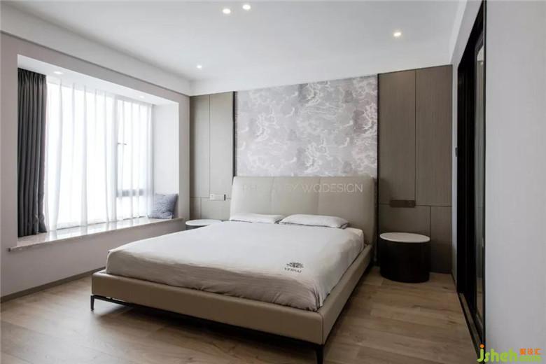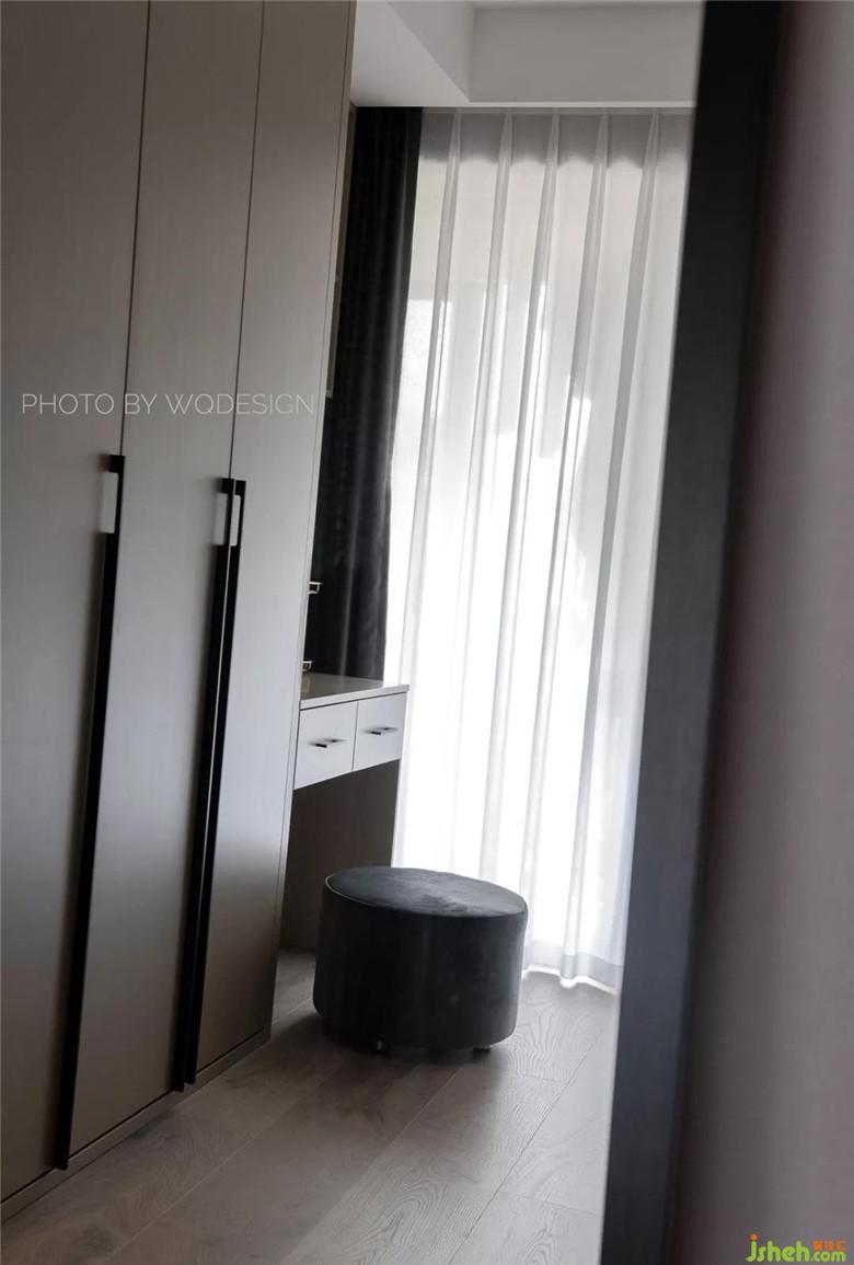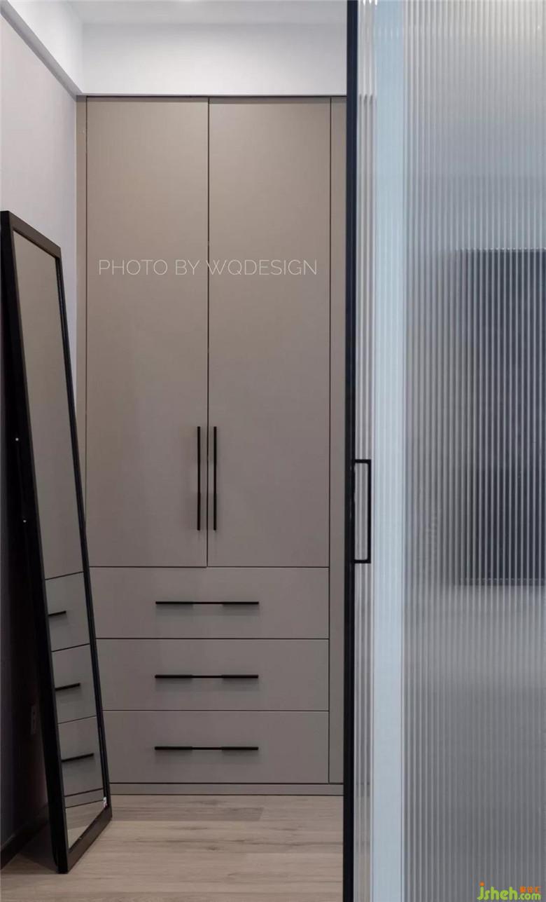 主卧原是两个卧室,将其中的小卧室改造成步入式衣帽间,两个空间的隔墙也向衣帽间推进,增加主卧的面积。两个空间的隔断是长虹玻璃门,同时面向公共区域是隔音较好的移门。夜晚休息、洗漱、早起穿衣可以在主卧一个空间内完成,方便、隐私性也极好。