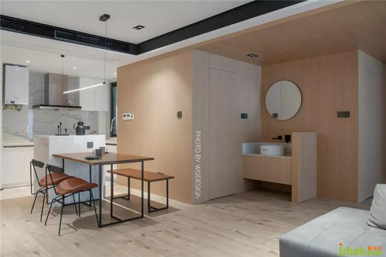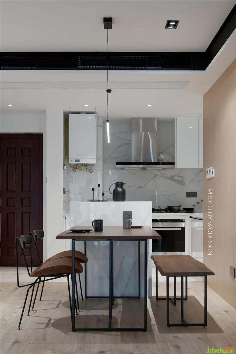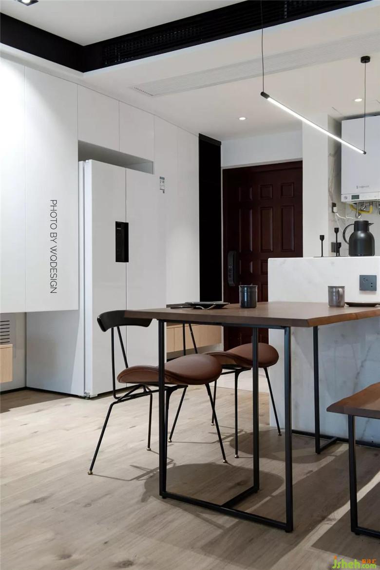封闭的小厨房拆掉,做成开放式厨房,和餐区的中岛台参照呼应,形成互借空间,空间得到提升。