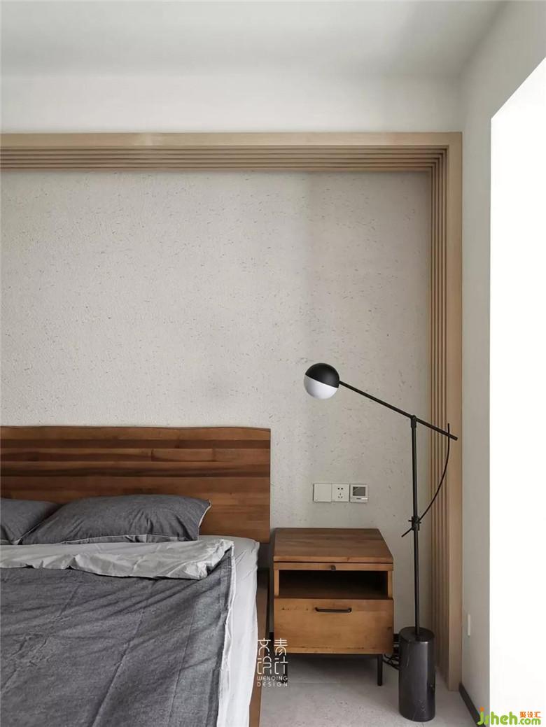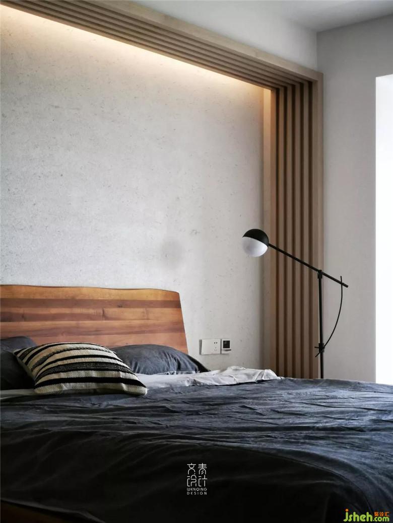 主卧背景墙梁下用原木条搭框作造型,以此来弱化梁所在的不适感。装修公司