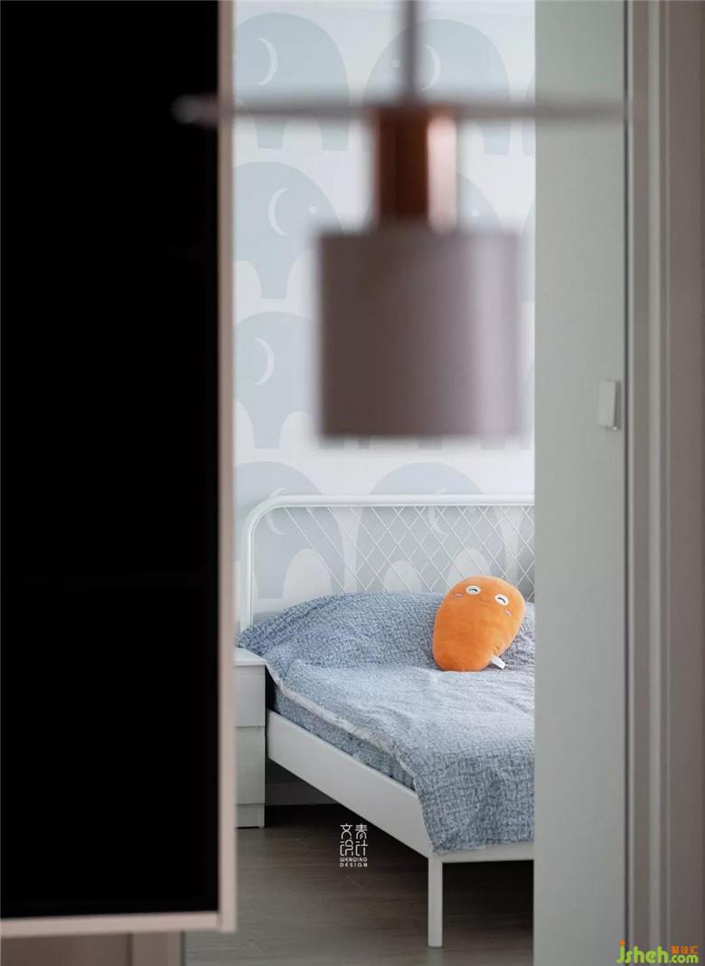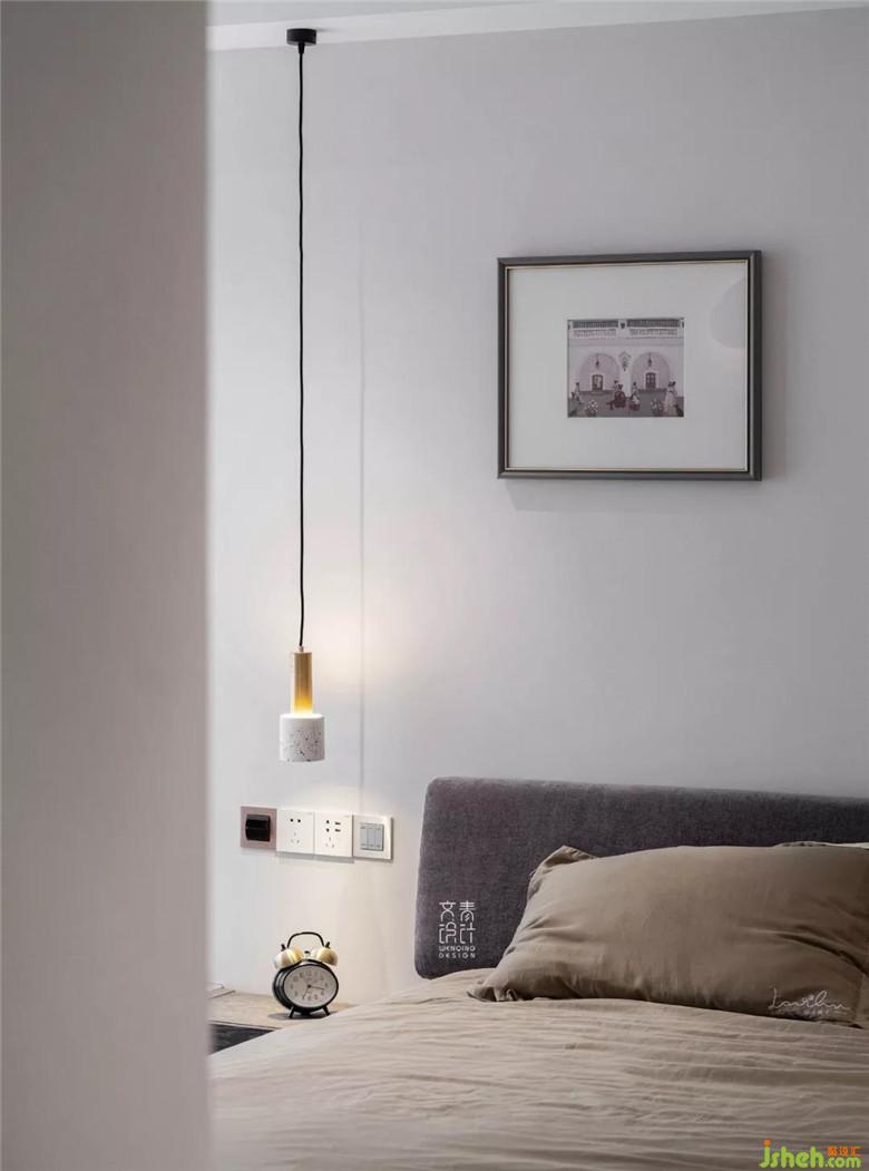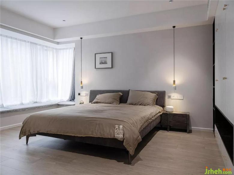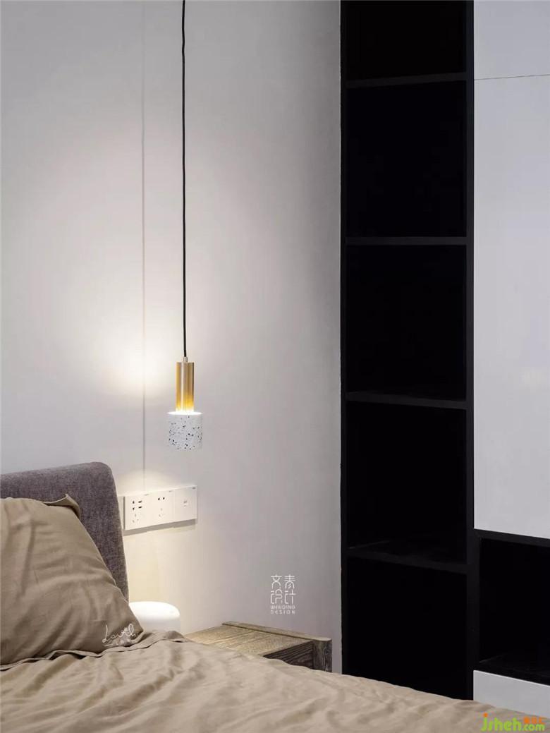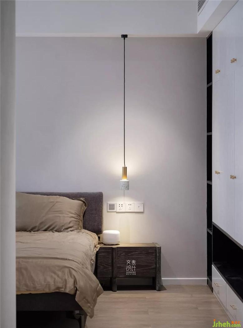 主卧进门口向卫生间推出小一米的空间,留出的空间定制下一长排的衣柜。衣柜中下凹进的黑槽用来放衣物也比较方便。