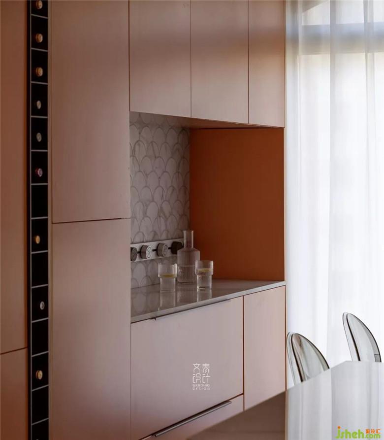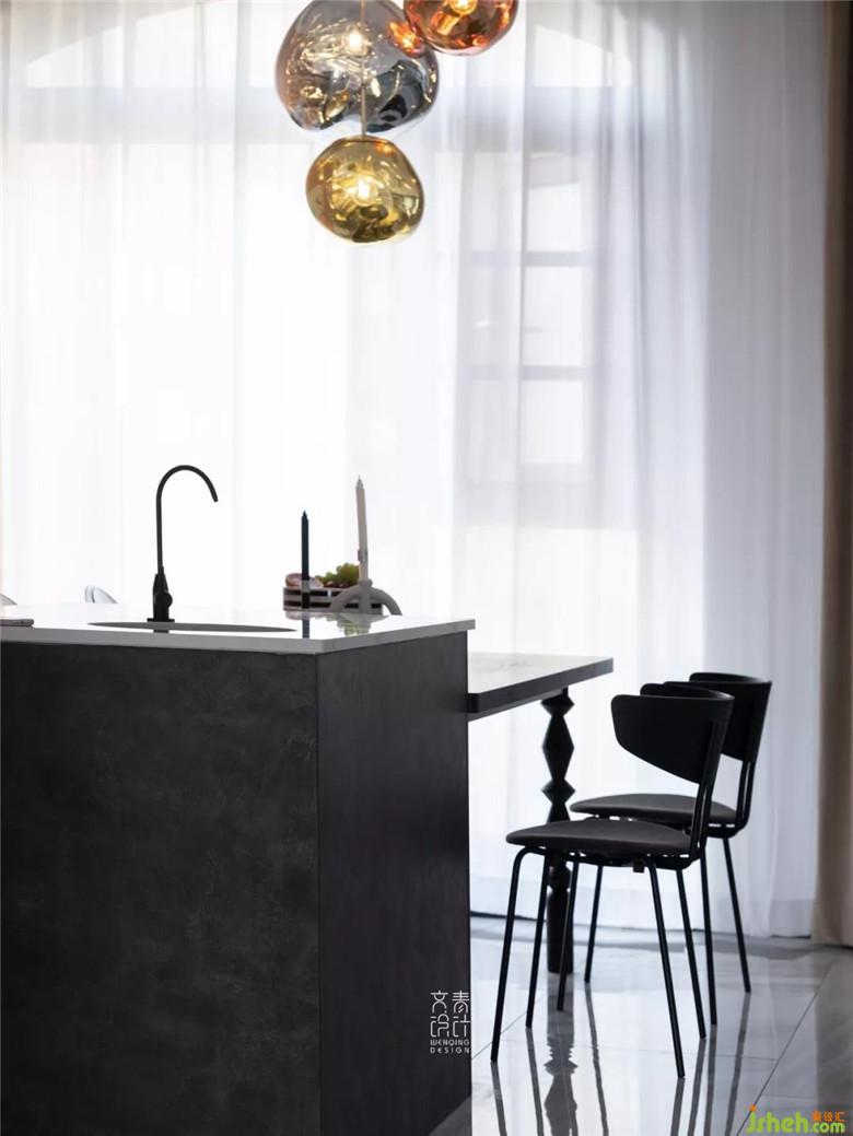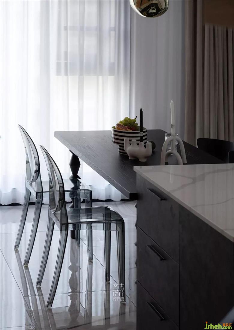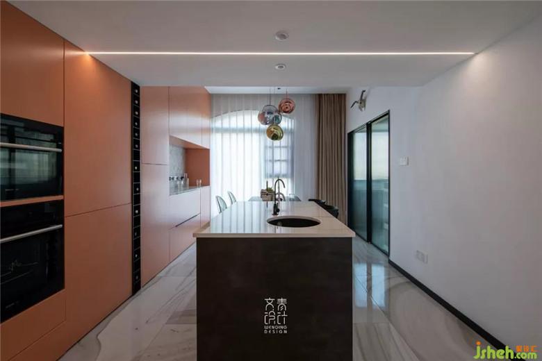 移出厨房的带洗手池的中岛、蒸烤箱、水吧台,分担出厨房的一大部分功能,这个餐厅俨然又是一个西式厨房。