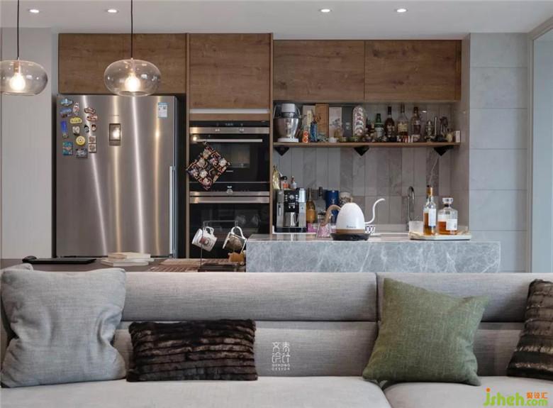水吧台分担出厨房的一大部分功能,装修公司规划好的橱柜也正好用来摆放业主旅游套来的饮品。