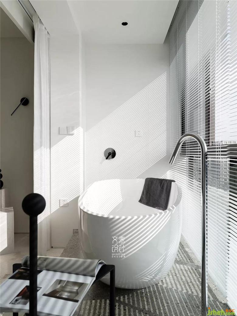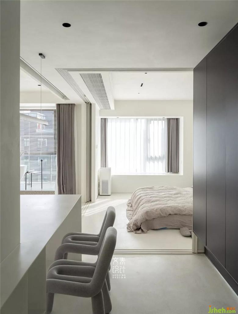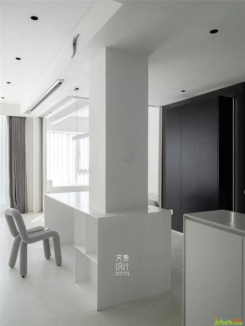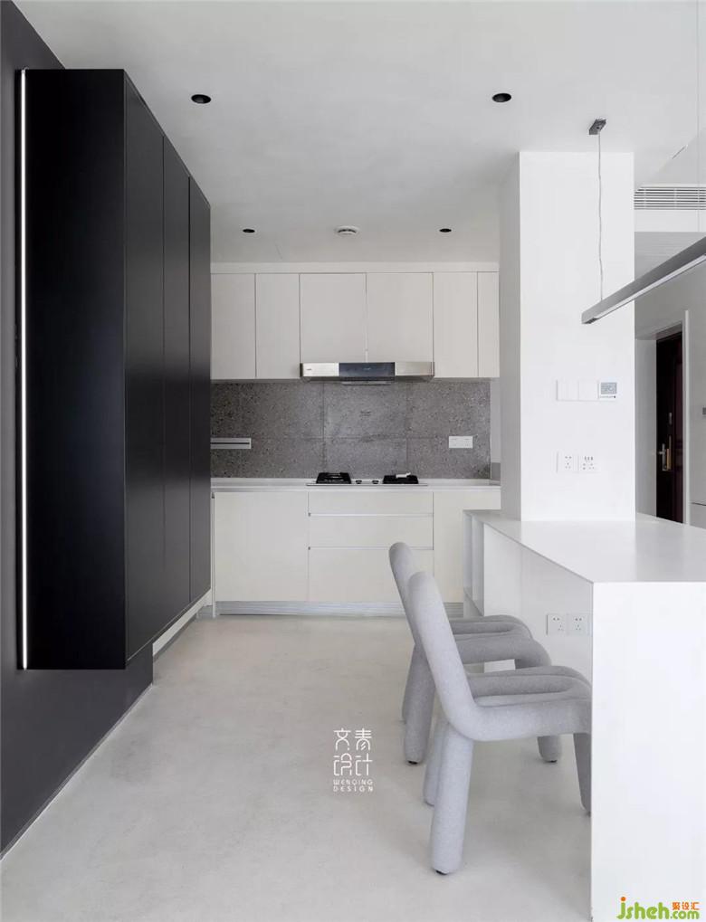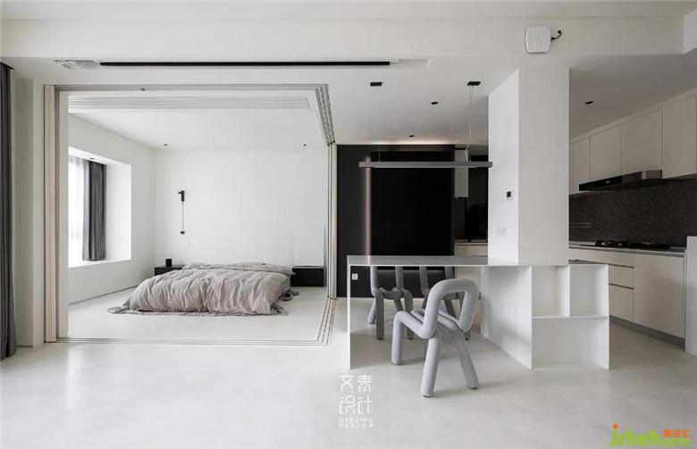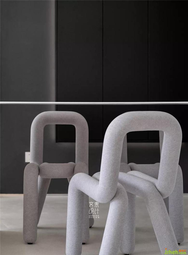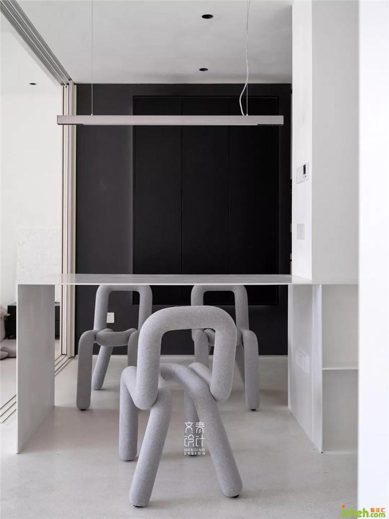 装修公司用仅不到10毫米厚的铸刚纯白餐桌,融于这一整个纯白空间的,丝毫不显得突兀。设计中减法做到极限的这里,在这儿就餐你也仅仅只会把注意力放在食物上。
