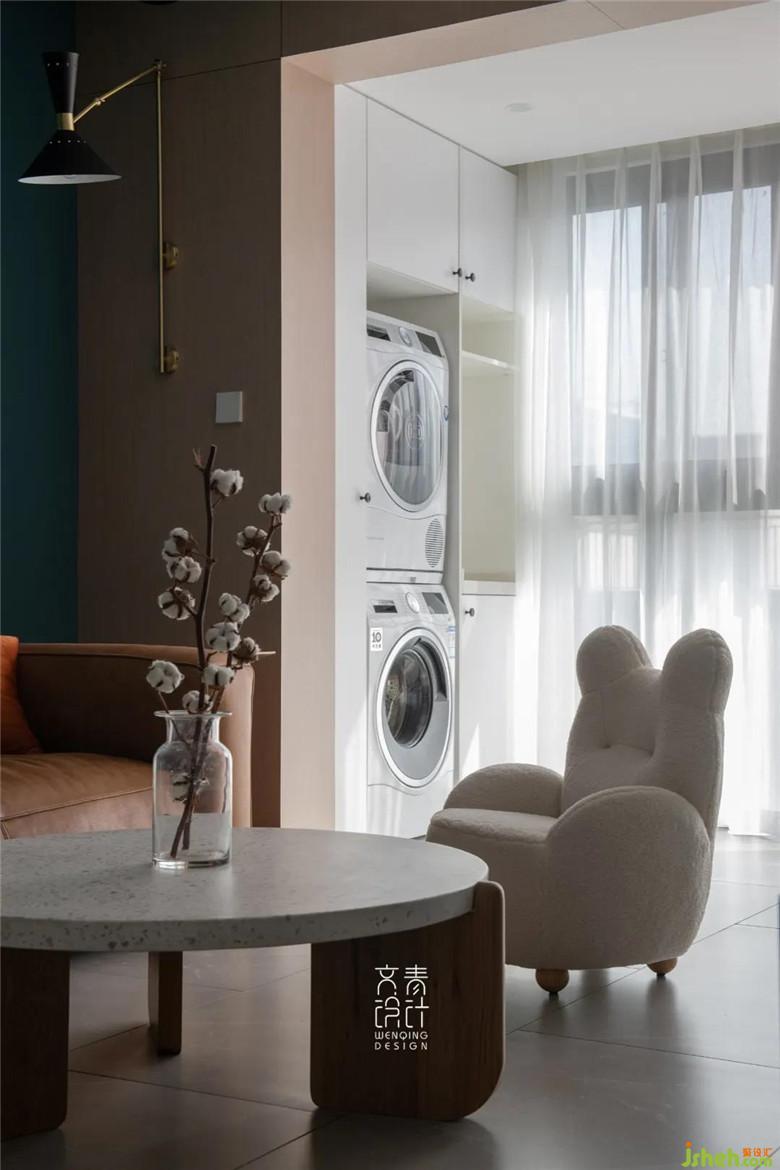 原餐厅拐角是设计中比较难以处理的问题,这里装修公司用色彩来区分空间,又恰恰利用了此处的凹槽,减少突兀感,画面也让强迫症十分舒服。