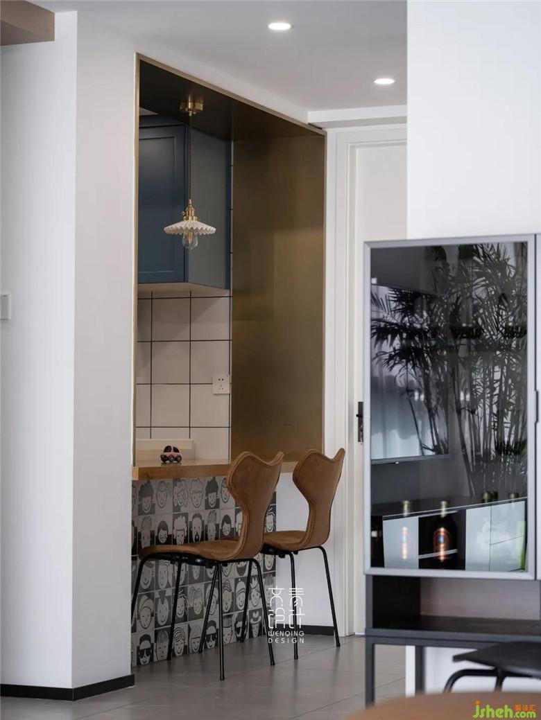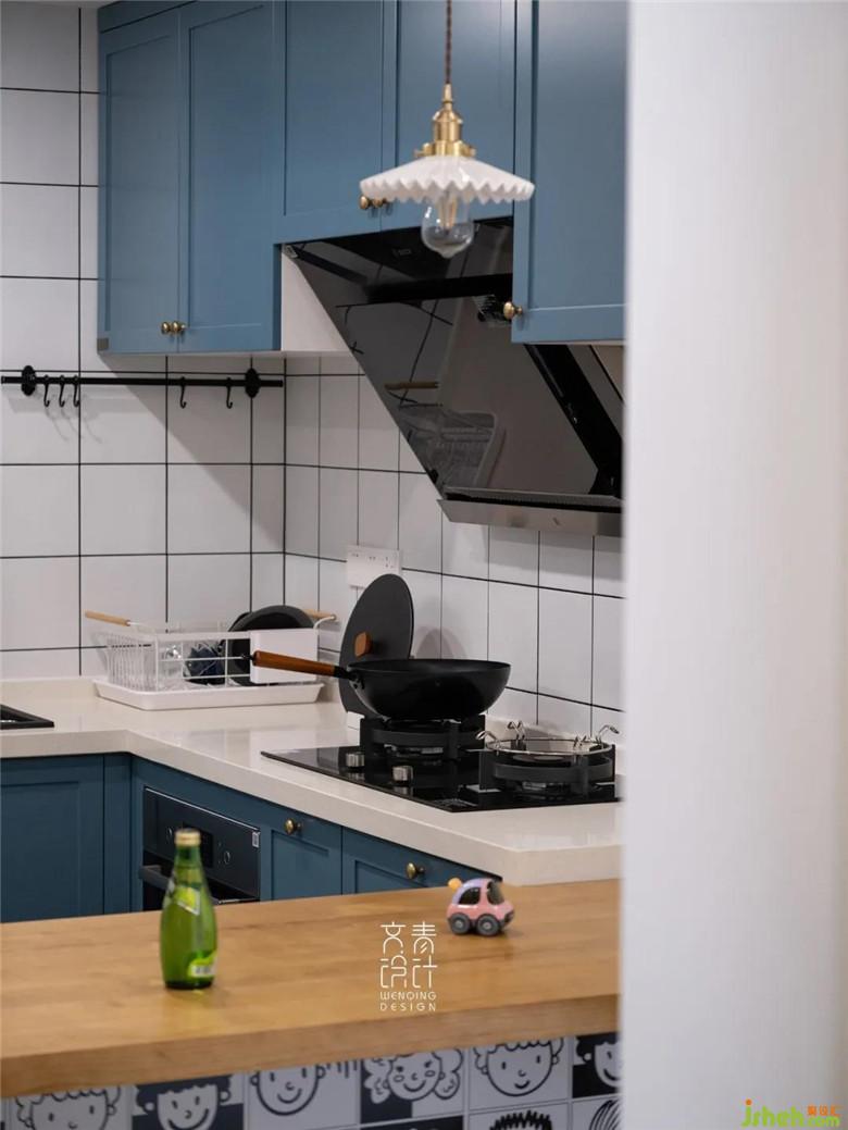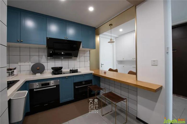 厨房色彩同样是呼应客厅的湖蓝色,同时融入一些金属元素造型,规避了硬装改造后的暴露出的错乱的横梁、管道。
