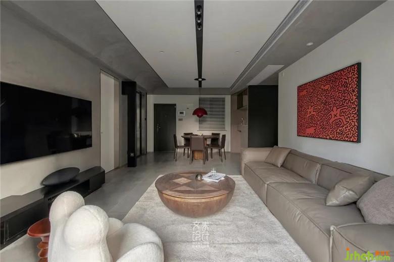 望着餐桌顶部暗红色的圆弧吊灯,弧形灯罩与客厅吊顶完美呼应融合,视线在不知不觉中就被带到了客厅。客厅不需要过多的储物功能,长条电视机柜用来日常收纳与展示, 电视机柜镂空部门也可用作为女儿的玩具收纳处。
