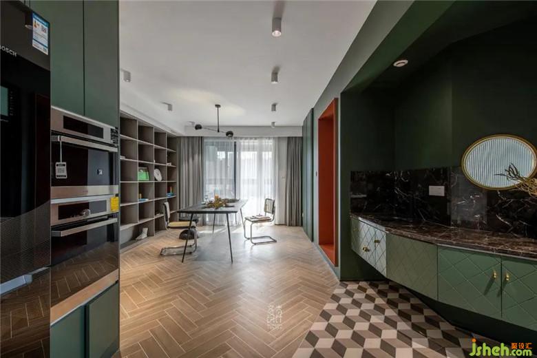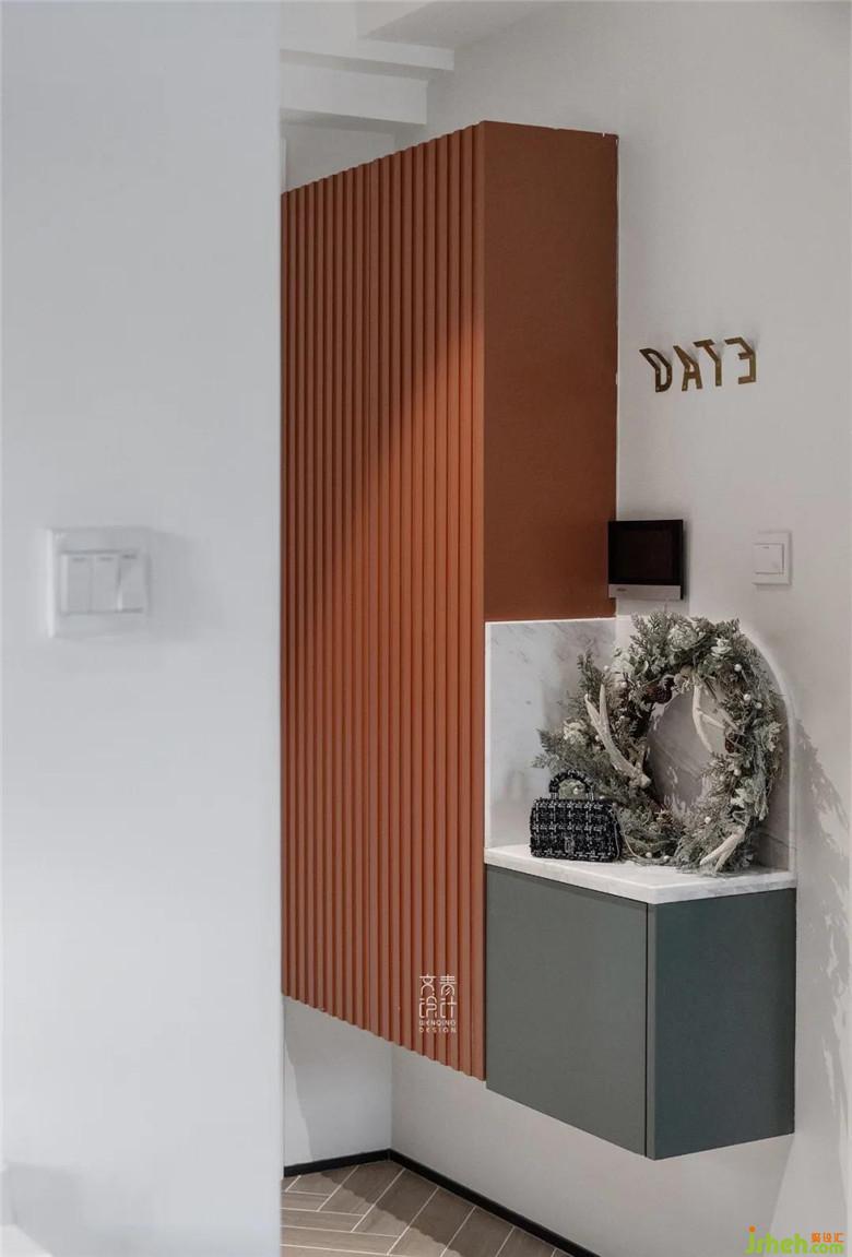 传统“顶天立地”式的鞋柜实用有余,但美感不足,装修公司的设计师将入户门右手边的鞋柜进行了错层设计,并用颜色巧妙的将使用区域区分开,同时也给视觉上带了一丝冲击感。