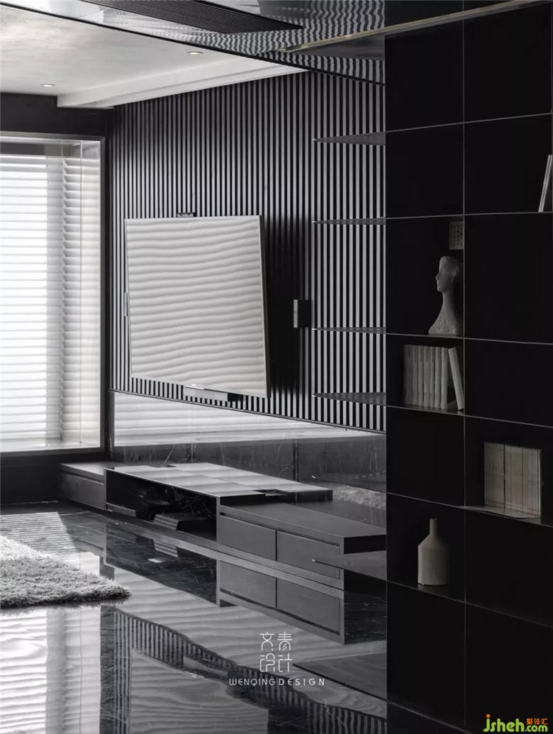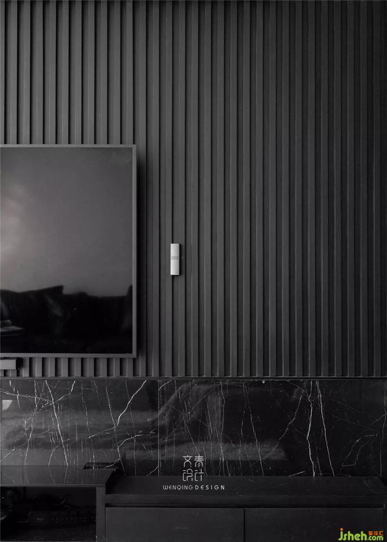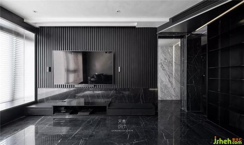 电视背景墙,黑色木头材质的栏珊,结合黑色大理石拼凑出层次感