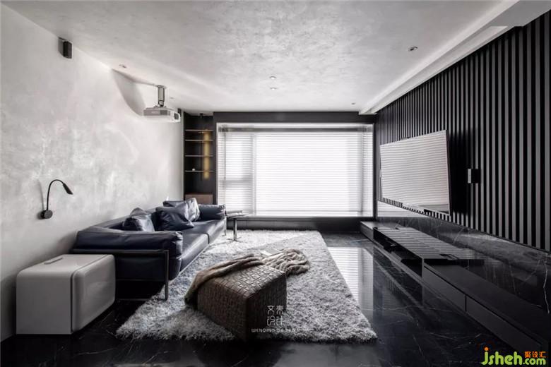有点夸张刷到天花板的艺术涂料;木头和大理石拼装组合的电视背景墙;“结实耐用”的不锈钢飘窗,除了这些质感丰富的硬装外,软装配饰也张弛有度。绵软地毯、皮质编织矮凳、充当边几的小冰箱,种种都流露着主人精致、高标准的生活体验。