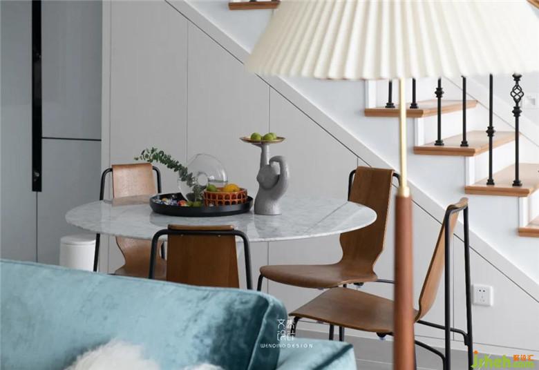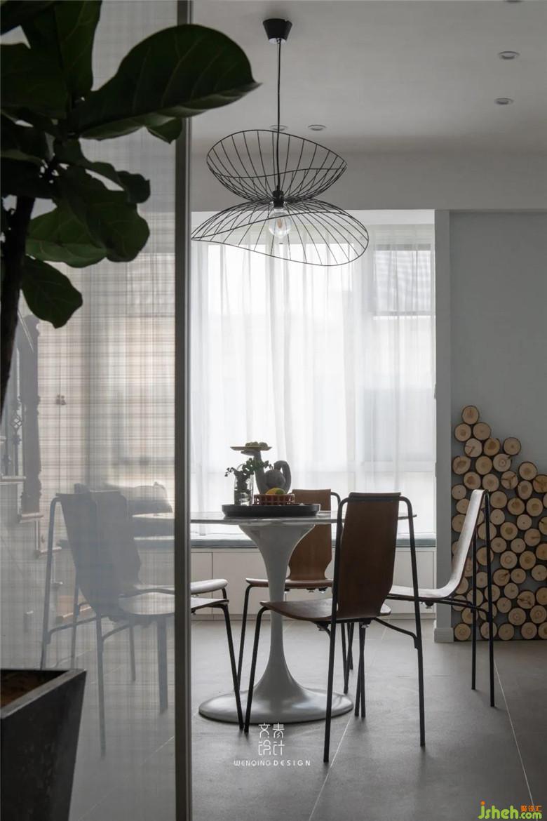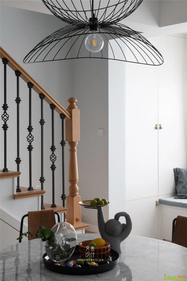 餐厅主要以简约为主,只用了一盏铁艺吊灯做装饰,与客厅仅“一步之遥”,提高了家人之间的互动性。