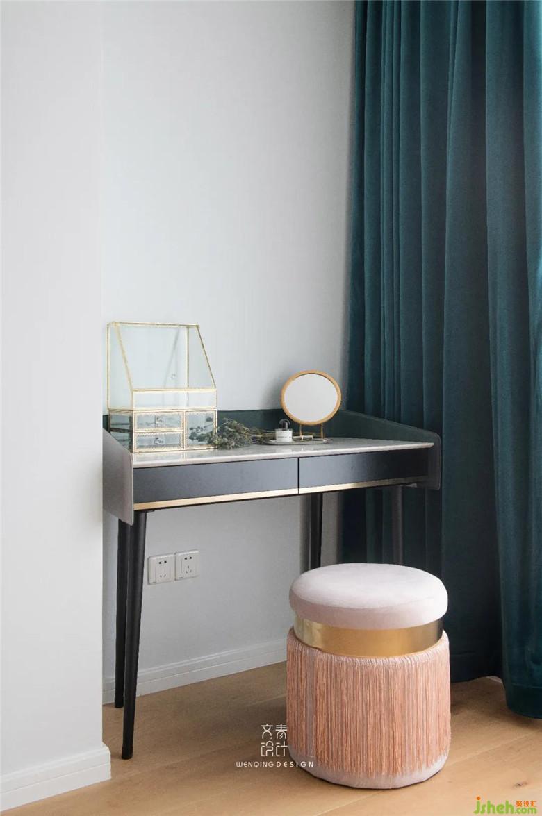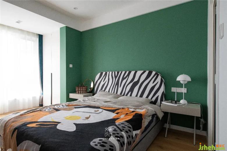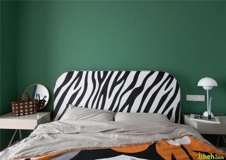 主卧装修公司采用了大面积的墨绿色来作为主色调,黑白条纹的床靠背直接拉近了人与自然的距离,设计师将森林系魔法融入到了生活中。