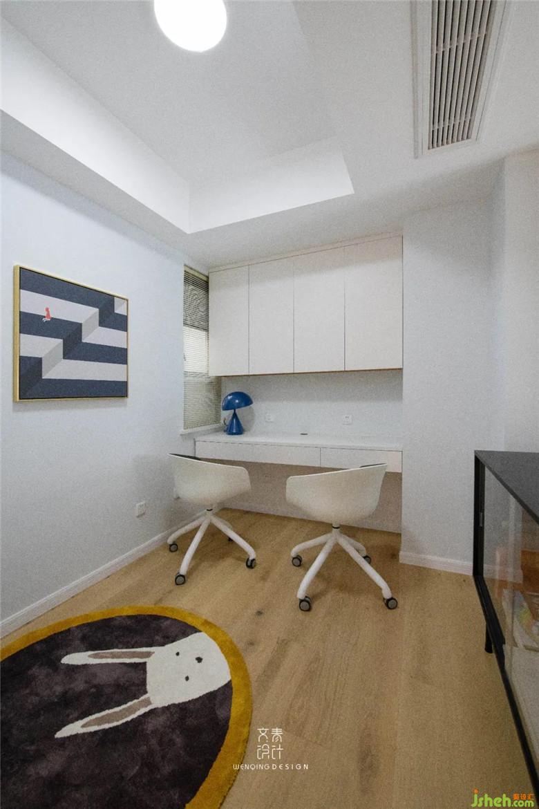 书房是能让人放松身心的空间,在保证整体基调简约清爽的同时,地毯外圈的跳色成了空间中让人眼前一亮的存在。