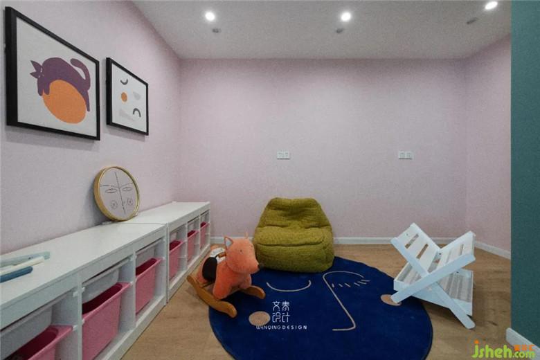 儿童玩具房为了尊重主角,整体风格尽可能的偏卡通风,整排的柜子提供了足够的玩具收纳空间,考虑到安全性的问题,柜子的都做了包角处理,插座也被安置在儿童碰不到的半墙位置。