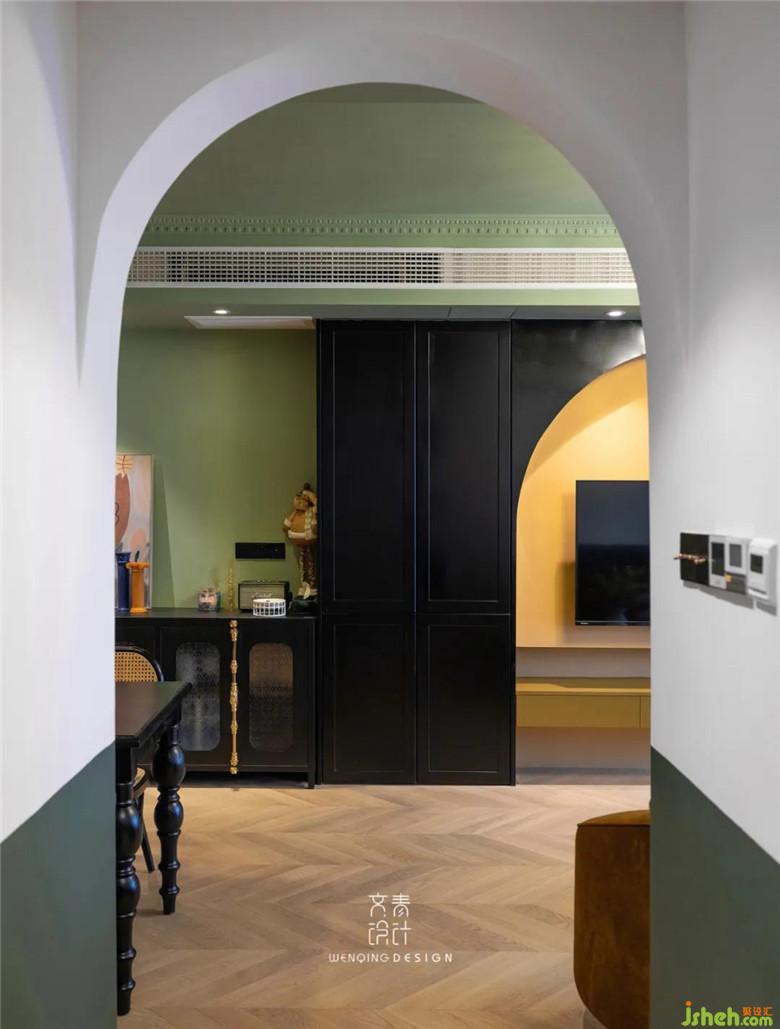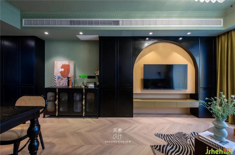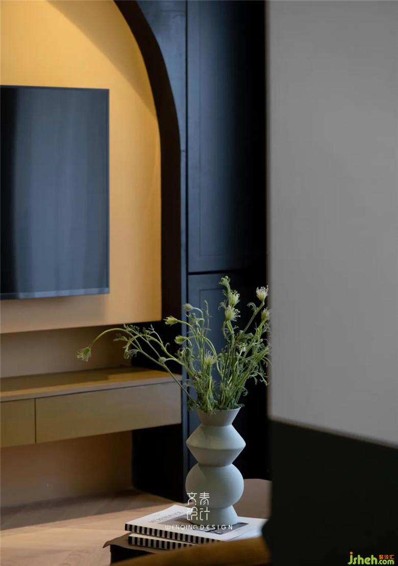 在电视机两边装修公司做了封闭式收纳柜,来作为日常的储物需求,中间的圆弧形木作不仅起到了装饰作用,也遮盖了柜体线条太过硬朗的问题。