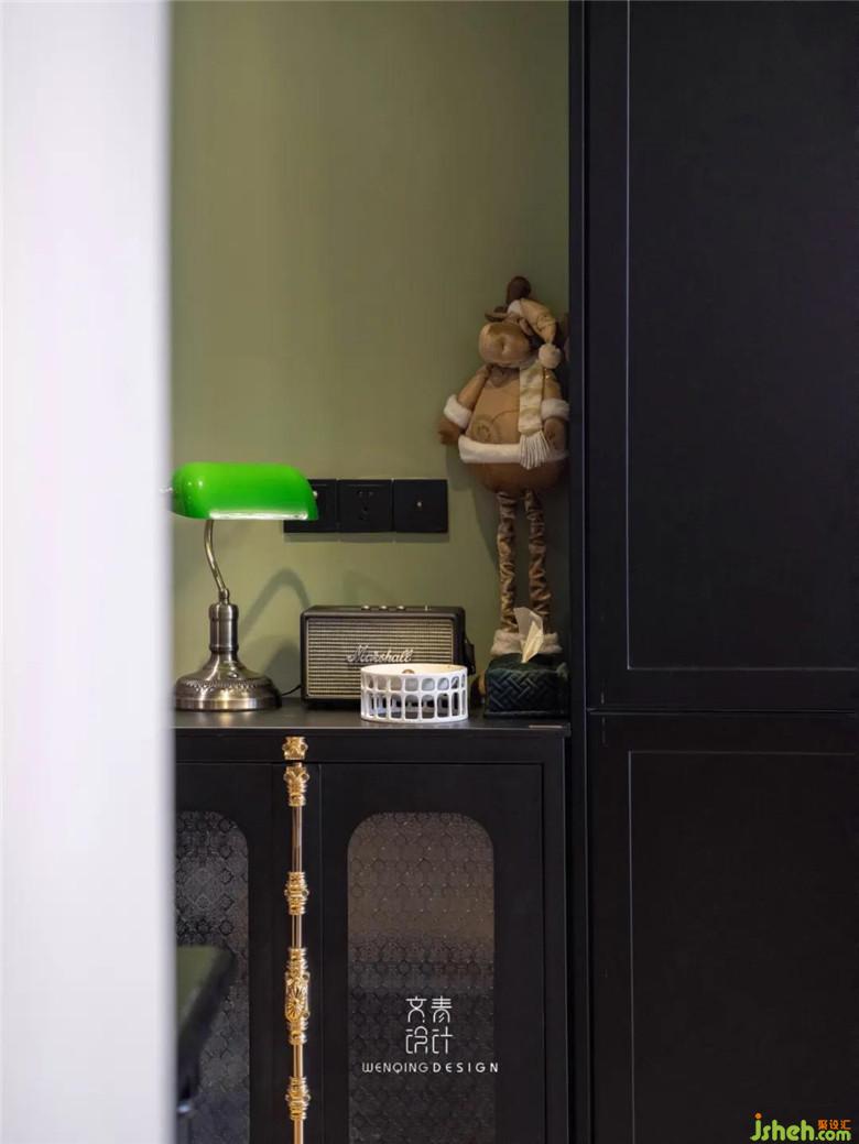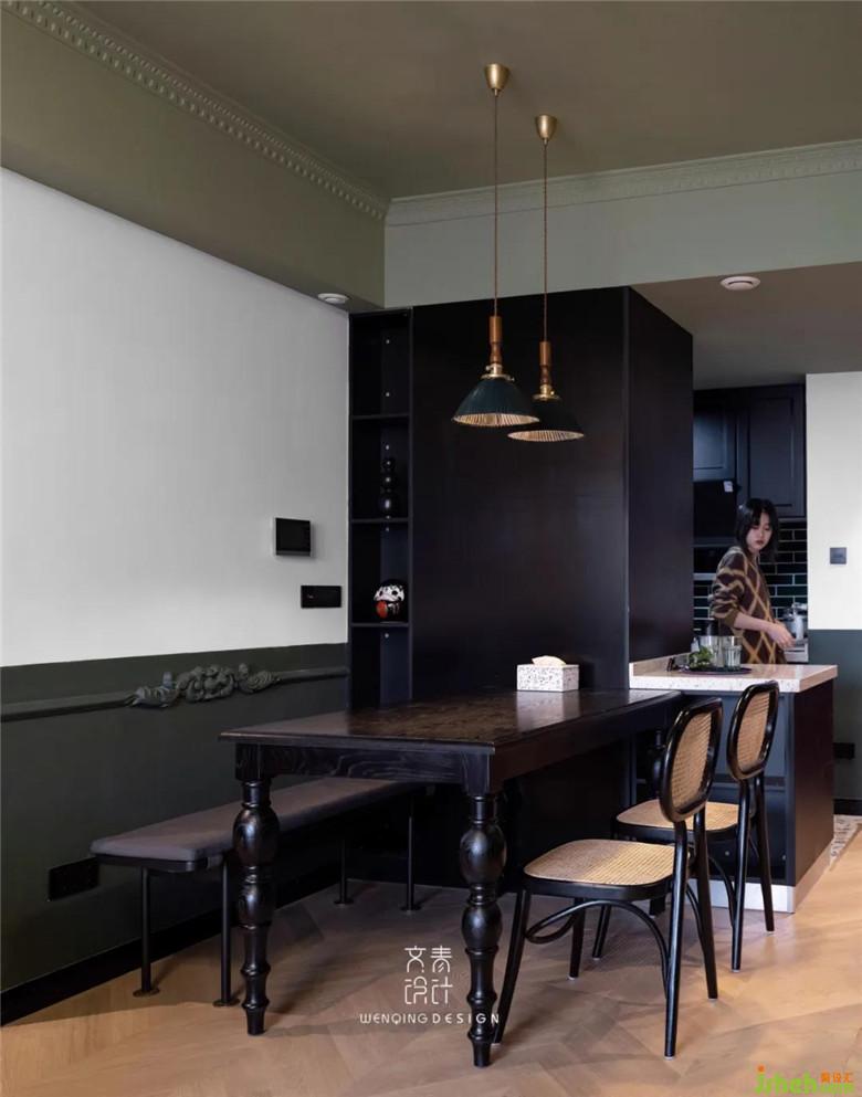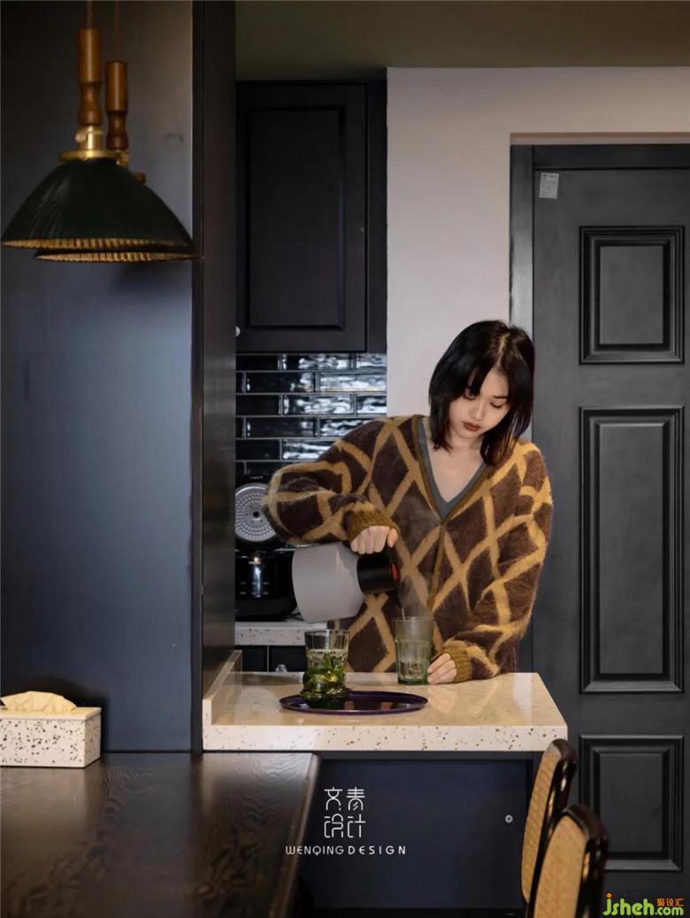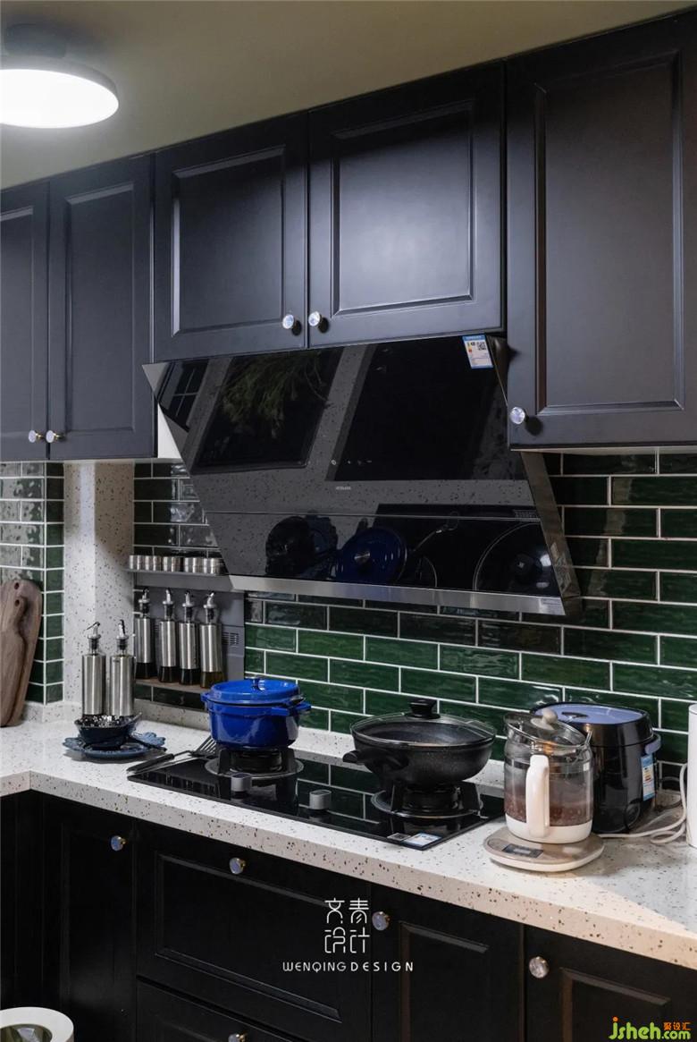 橱柜跟随了公共空间的主色调,同样以沉稳的黑色为主,装修公司为了不那么单调,在墙面选用了复古绿的瓷砖来调和。