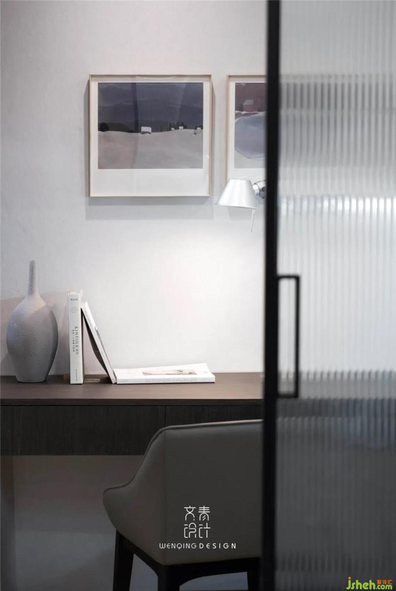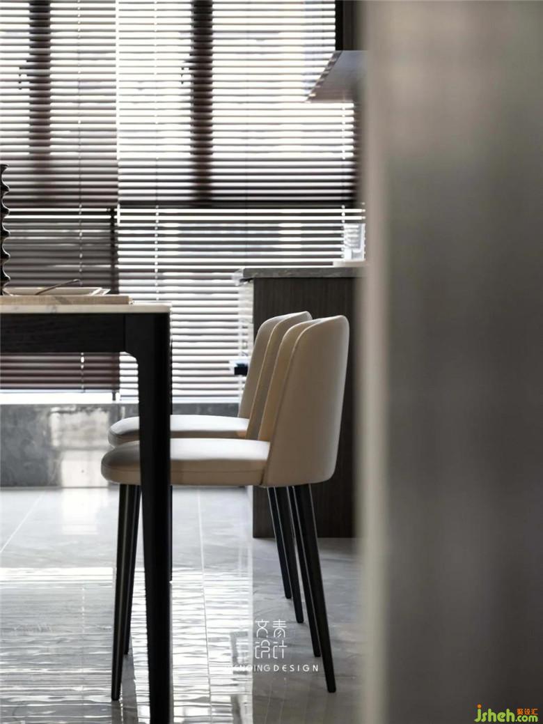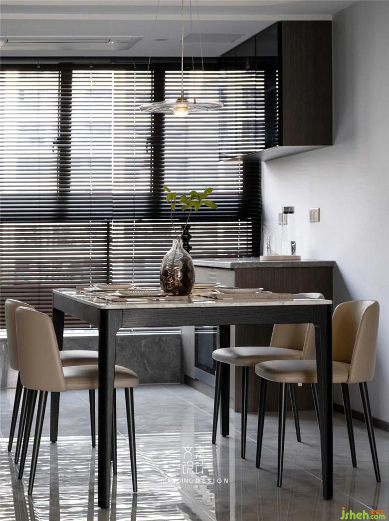 餐厅也有标配的阳台,本着不浪费每一寸自然光的原则,装修公司采用了有着“光影魔术手”之称的百叶帘,业主有时会在餐桌上办公,阳台的矮柜就成了“办公区”最好的水吧台。