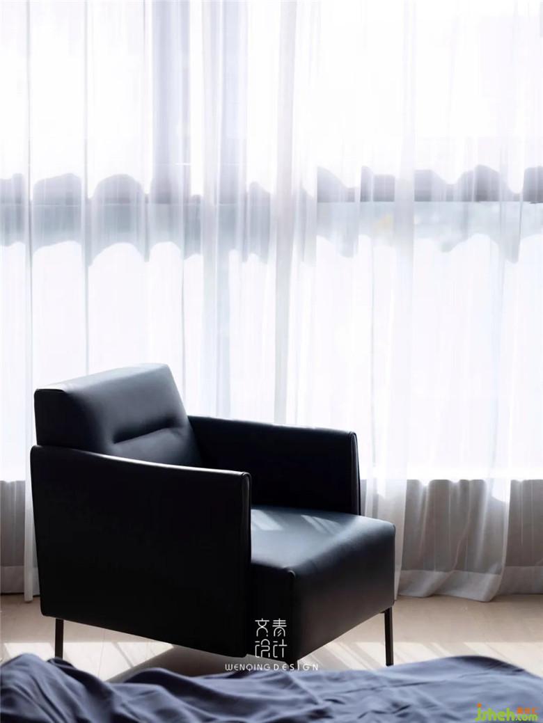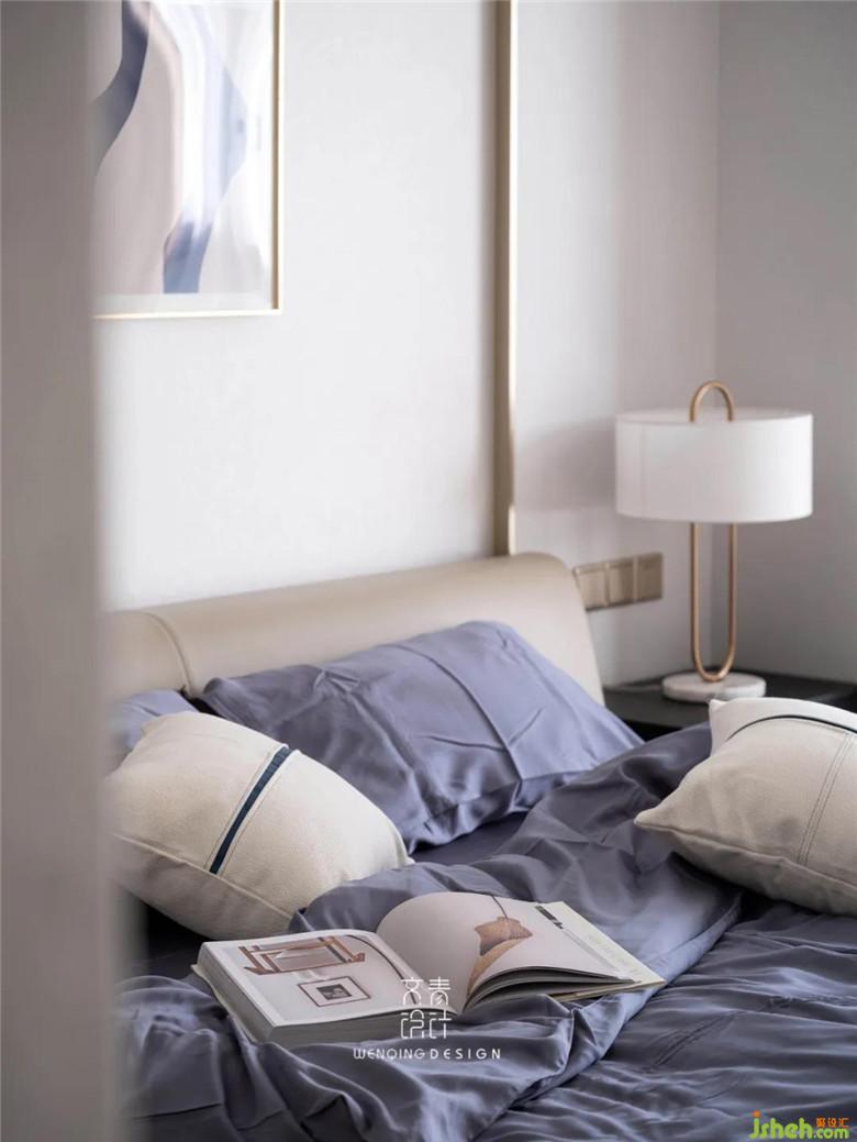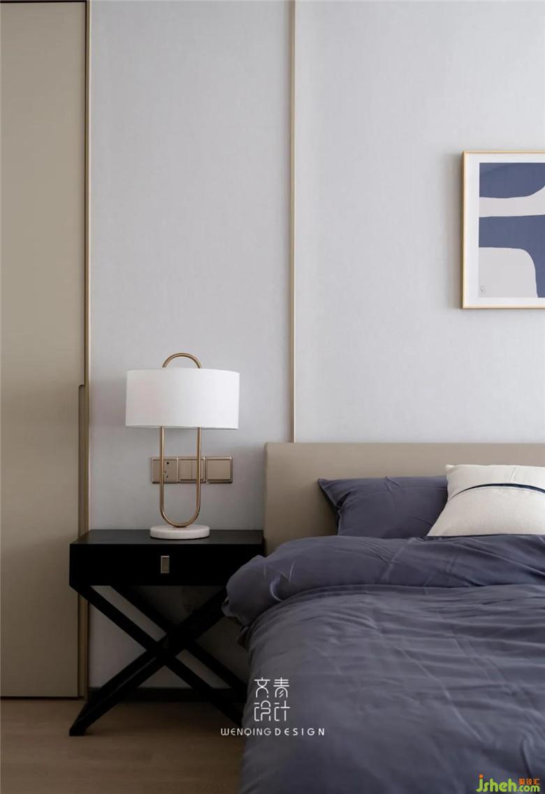 主卧延续了整体舒适的基调,在床背景上我们做了一扇通往衣帽间的暗门,虽说主卧配备的衣帽间不大,储物功能却很实用,换季衣物都能有收纳的地方。