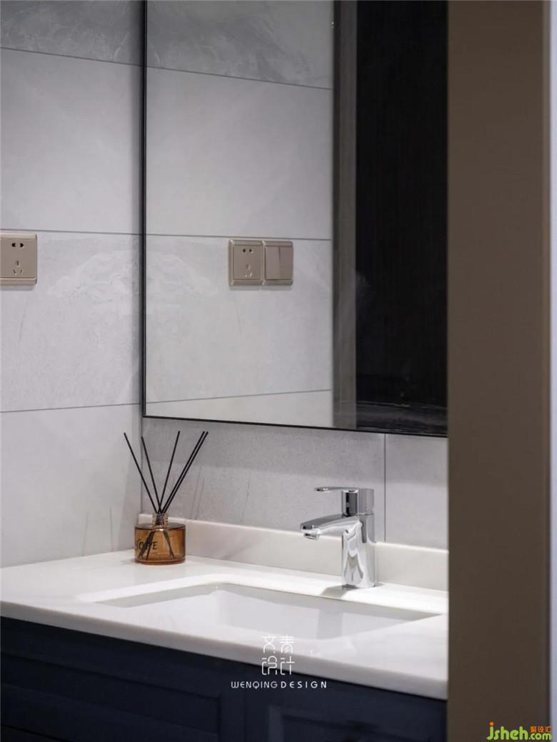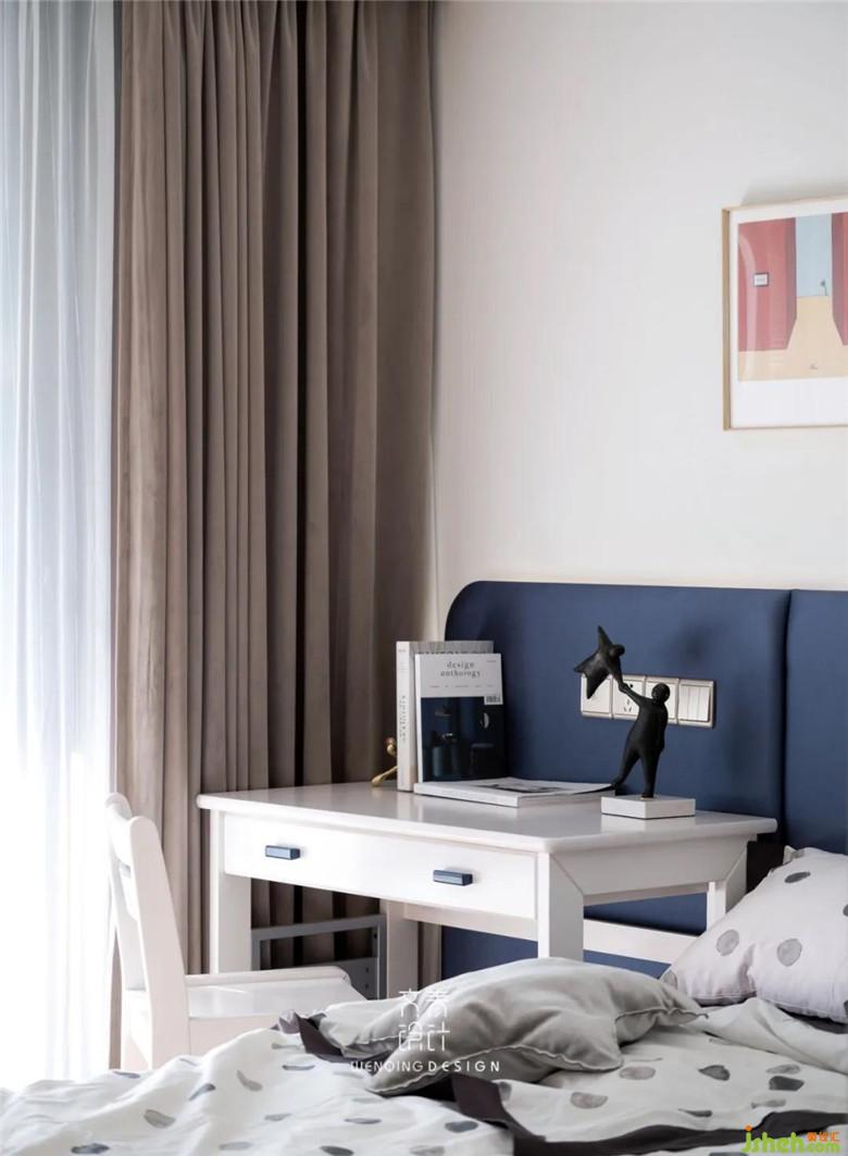 我们将次卧的床靠背做了延伸处理,“一物两用”既是床靠背,又能做为书桌的背景,整体看上去也会更加统一。