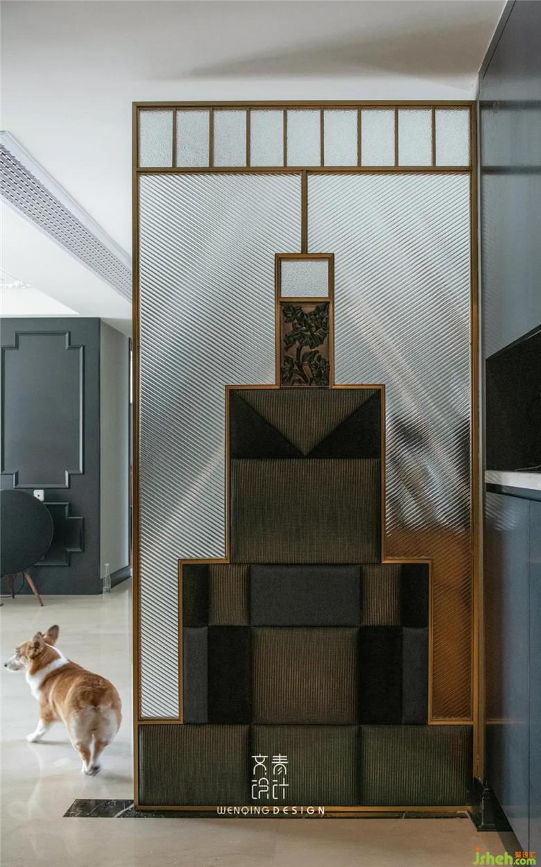 当初为了定制这块屏风,跑了很多的工厂,因为是长虹玻璃、布艺软包和实木雕花不同的材质组合拼接,制作难度极大,很多师傅都不敢打包票。值得庆幸的是,屏风最终出来的非常好,也成了家中最具Art Deco风的装饰。