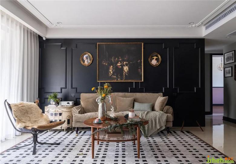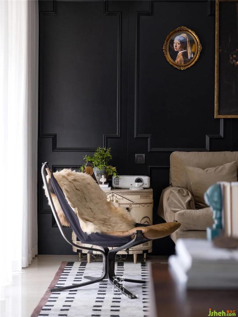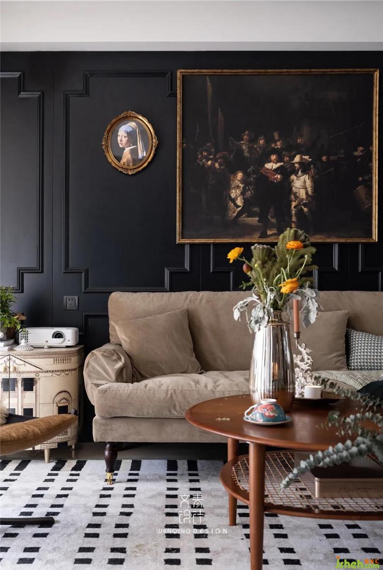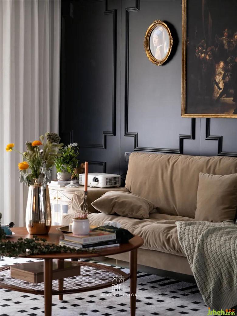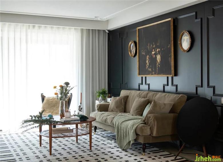 客厅装修公司做了到顶的黑色护墙板,同时又能与吊顶的石膏线条互相呼应,用精美雕花的石膏线来打造细节,可以让空间增加一些复古的线条,使得空间不过于寡淡。