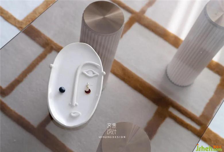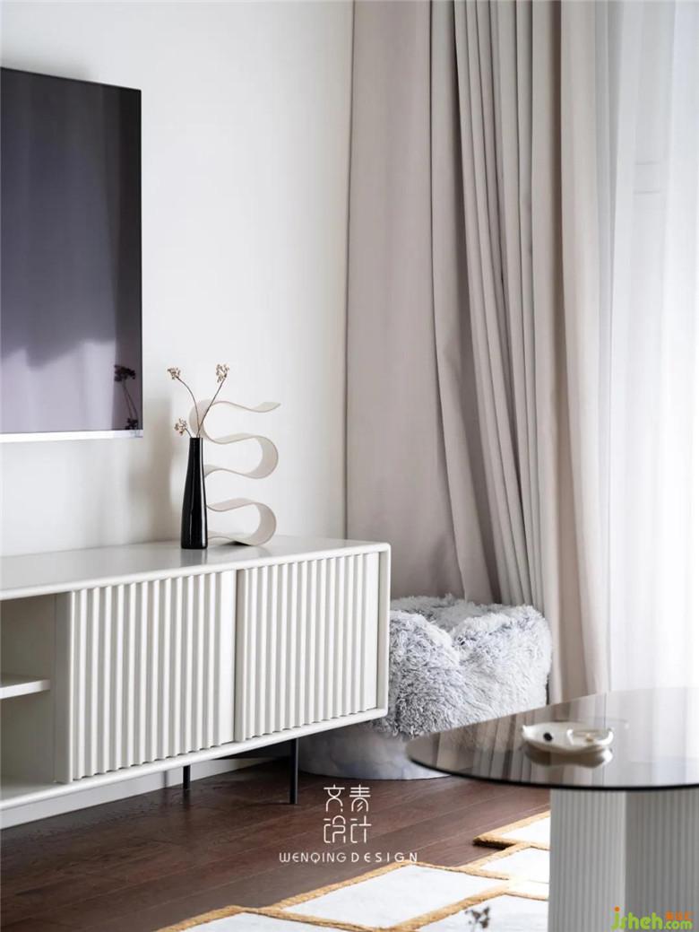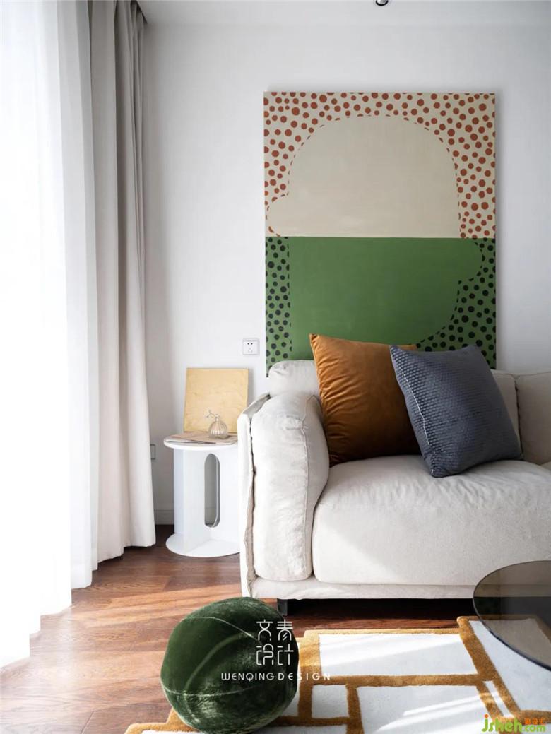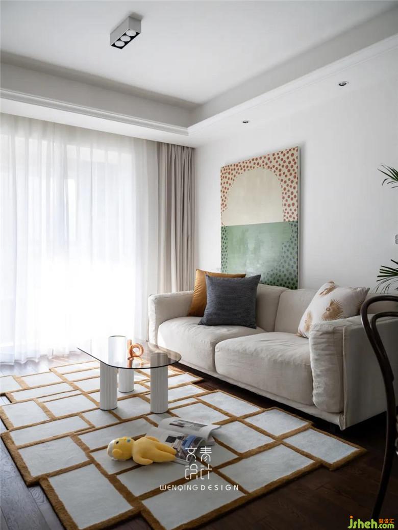 客厅原本就是简单的大白墙,装修公司将客厅整体墙面做了暖白色的乳胶漆,让空间更加明亮温暖。地毯也摆脱了中规中矩的造型,几何图案的拼接,也让地毯更具延伸感。
