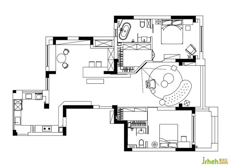 1. 将主卫墙体内推,敲掉客厅三分之一的背景墙,借用客厅空间新砌斜墙,为主卧配备衣帽间。