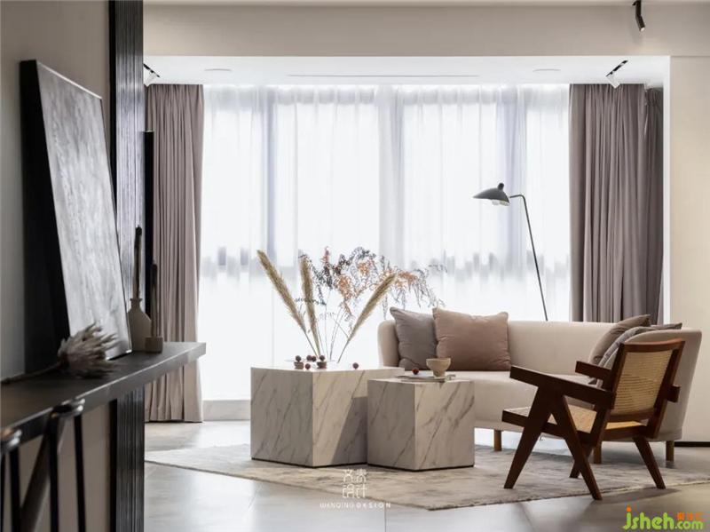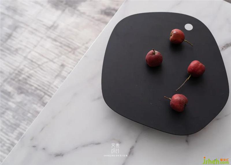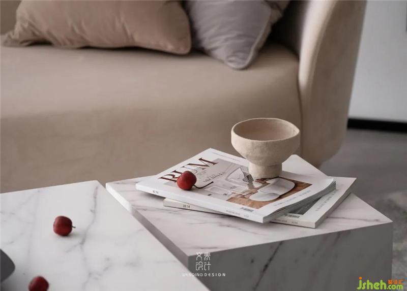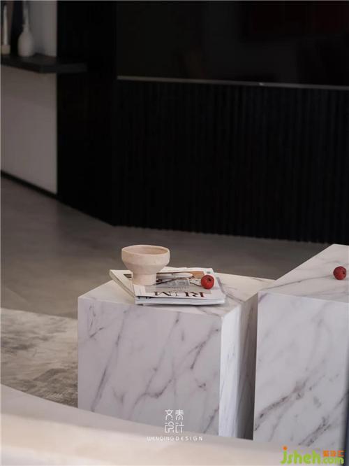 舒适坐感的绒布,保证最舒服最放松的居住体验,搭配大理石质感的茶几,杭州装修设计一柔一刚的碰撞,反而丰富了空间层次感。