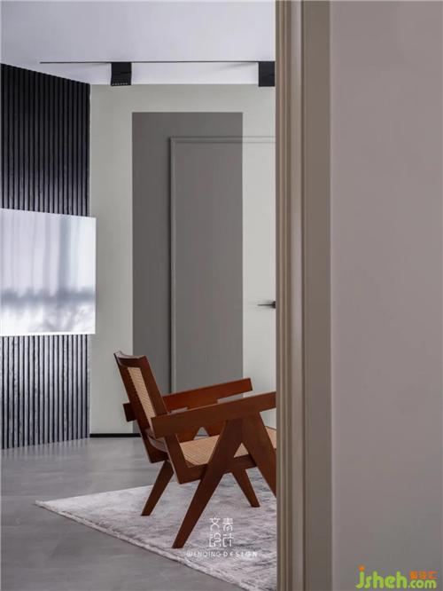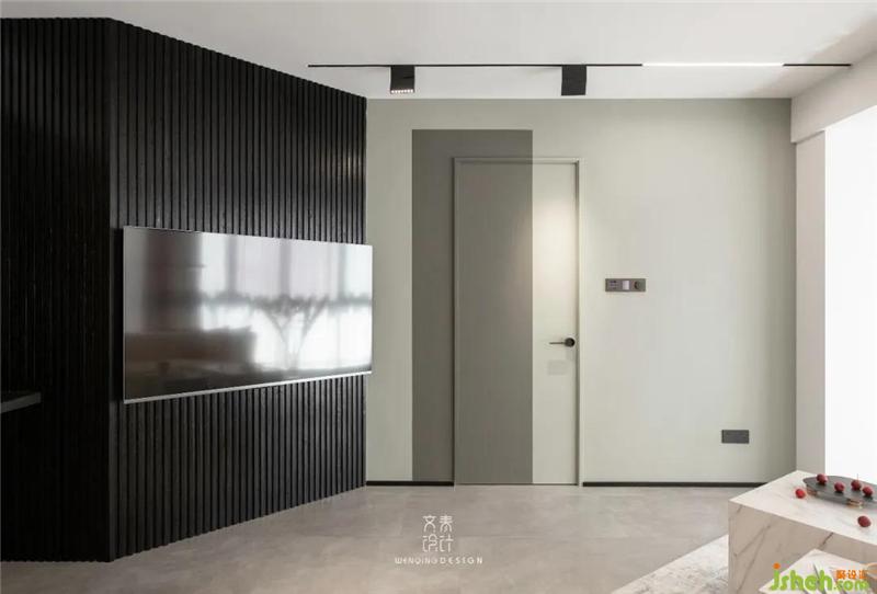 客厅原本背景墙被敲掉三分之一,仅剩不多的空间又被主卧房门分去三分之一,新砌斜墙就成了电视背景的最佳选择,定制竖条格栅拉伸层高延伸感,主卧房门也用乳胶漆色块装饰,将设计趣味性进行到底。