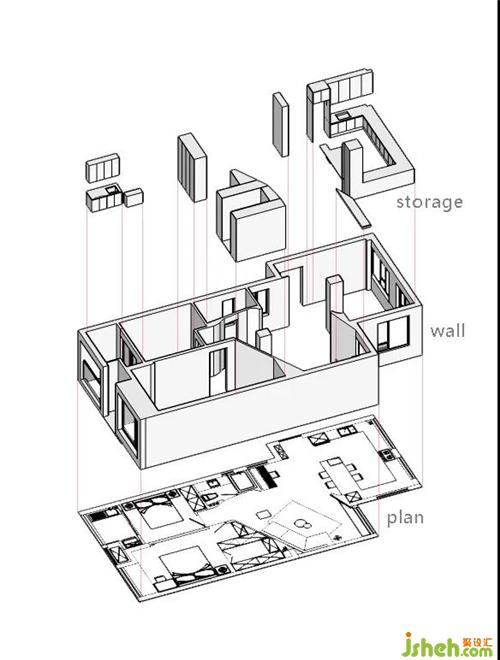 2. 将原本主卧卫生间墙体拆除,重新砌斜墙,扩大客厅使用空间。