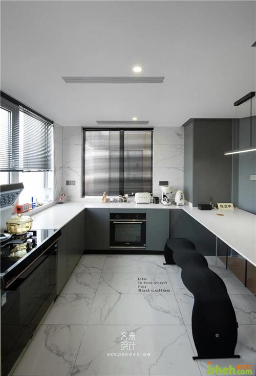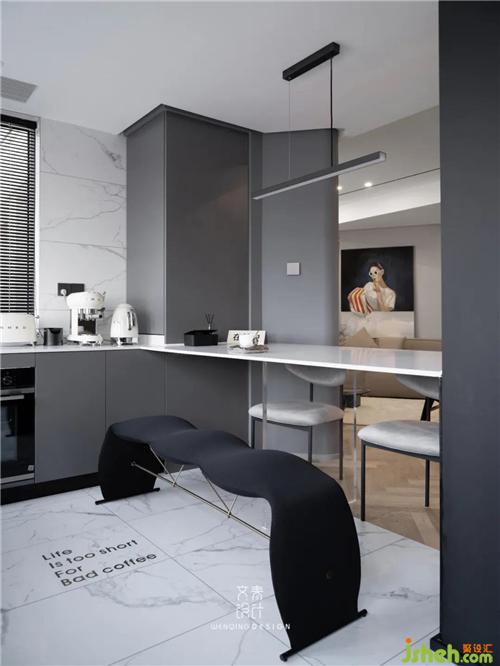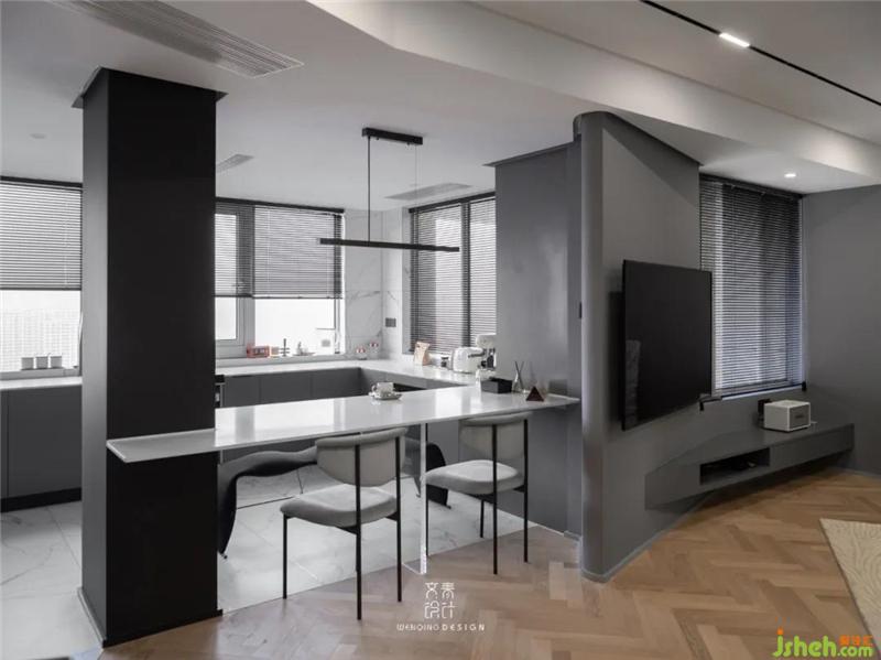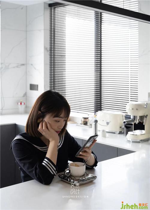 原本入户是局促的厨房空间,我们敲掉厨房与书房的隔墙,做成开放式餐厨空间,这样厨房就能拥有三面窗,扩大使用空间和采光面积杭州装修设计。