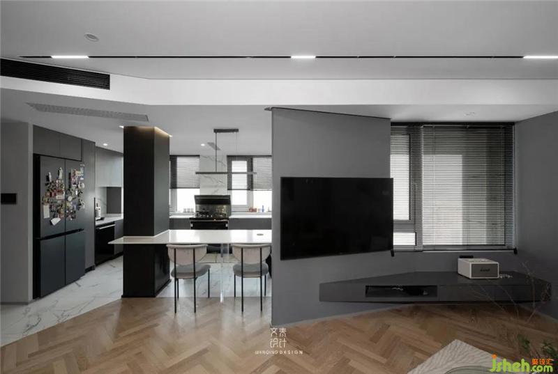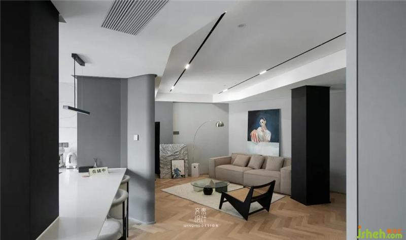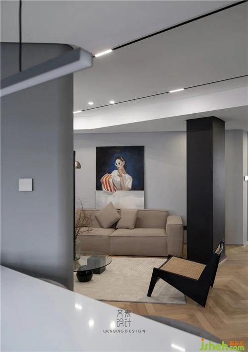 全开放式空间看久了会没有视觉焦点,这时不能拆除的承重柱起了作用,通过空间中梁的强调,来表达一种空间气质,同时在梁与吊顶接口处拉槽灯带的方式,使得梁有一种空间层高延伸感。
