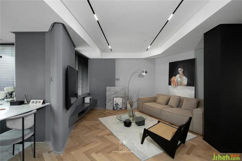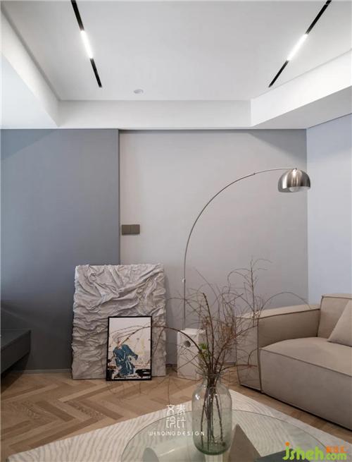 原本客厅空间布局过于方正局促,我们将原本主卧卫生间墙体拆除,新砌平行斜墙作为客厅背景墙,杭州装修设计扩大客厅使用空间,也能增加视觉上的趣味性。